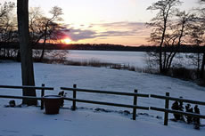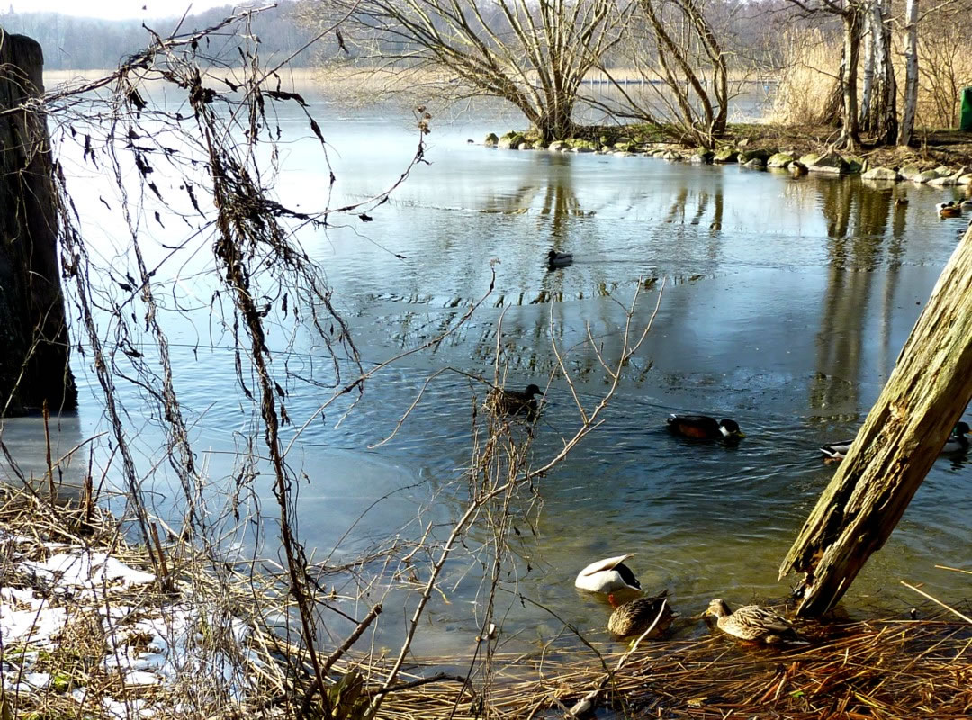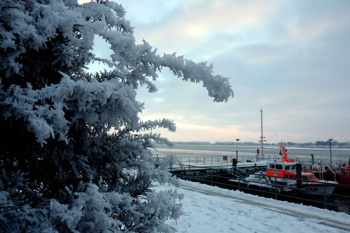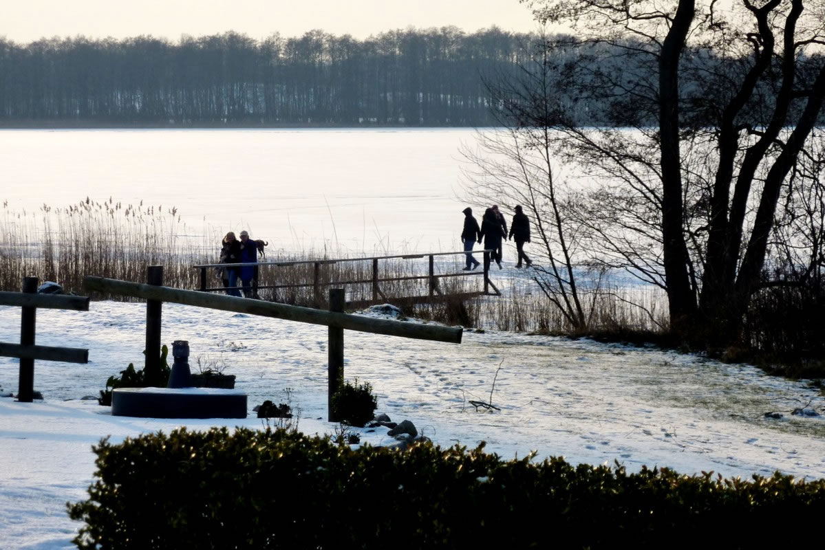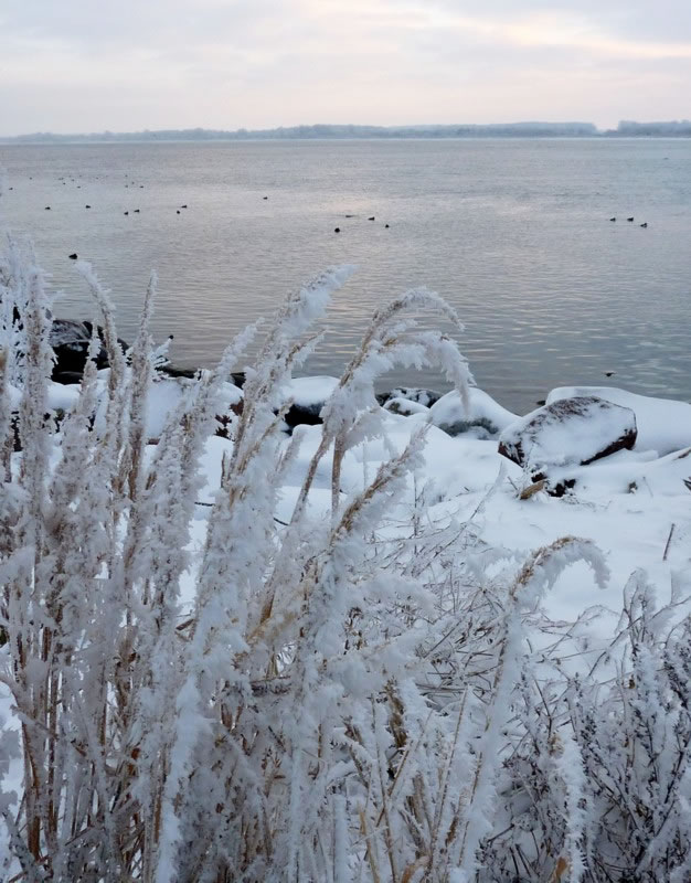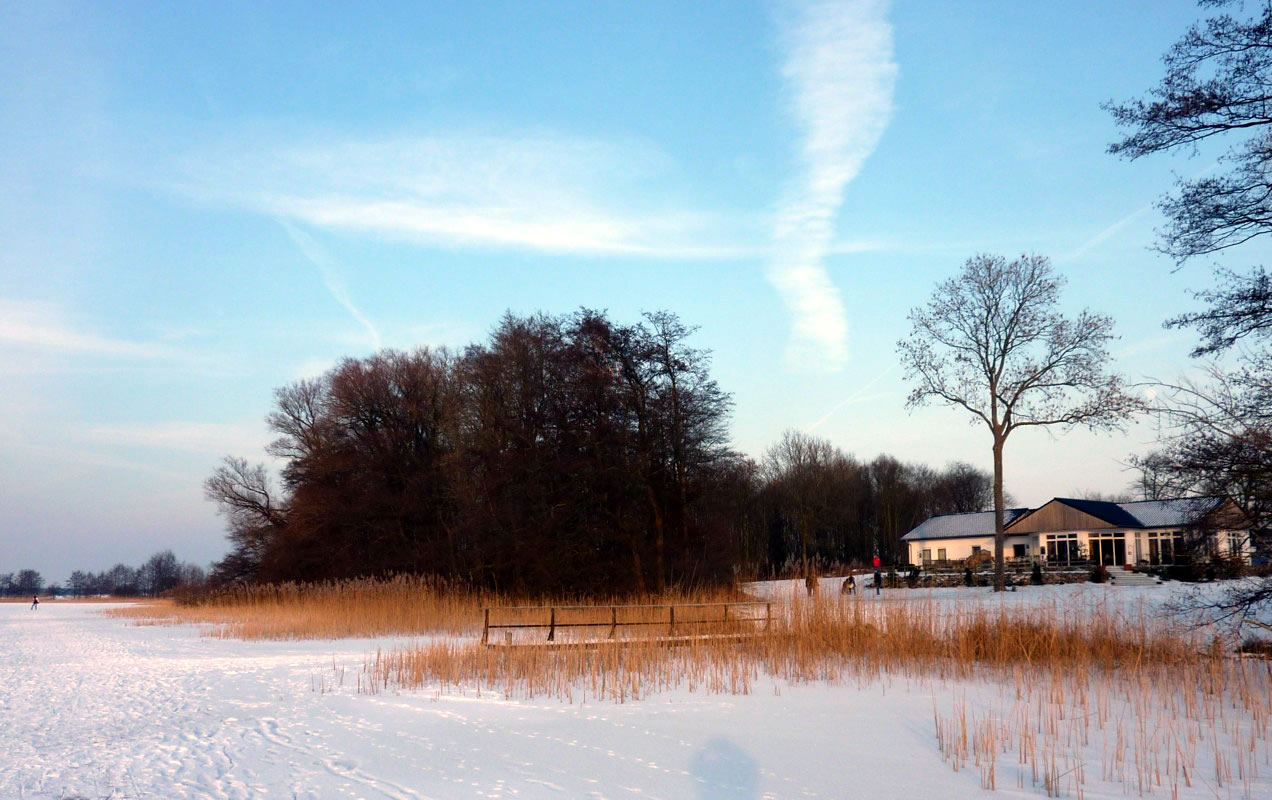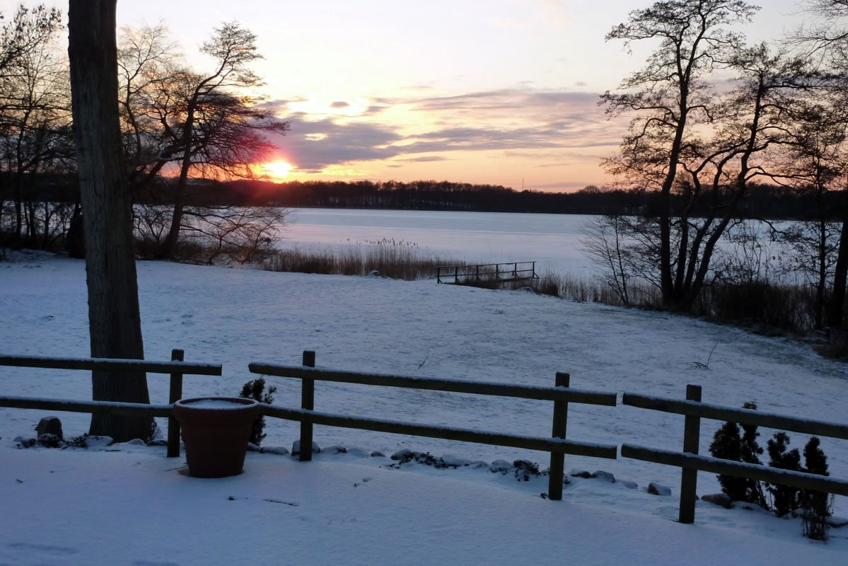 12.2.12 . .So schöön kann Winter sien! Dat weer noch düster. In de Nacht harr dat Steen un Been froren. Dat Thermometer wies an'n Moorn 15°C Minus. Brrr! Wat weer dat koolt! Am leevsten weer ik glieks wedder in mien warmes Bett kladdert. Aver dat güng nich, ik wull hüüt noch allerhand up de Reeg bringen. In de Twischentied weer de Sünn opgahn. Se lüüch vun schiern blagen Heven. De ersten Strahlen keken al in't Finster. Dat sehg na enen herrlichen Winterdag ut. "Den mütt wi geneten", meen ik bi't Fröstück to mien Mann. Na't Meddageten trocken wi uns warm an. Över versniete Dörper güng uns Fohrt na Wilmsdörp. De Sünn stünn al teemlich deep. Ehr güllen Strahlen glemen dörch de Bööm över den Hemmelsdörper See. Wi wullen in den Seepavillon en Tass Kaffee drinken.