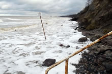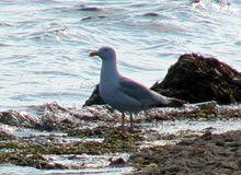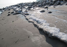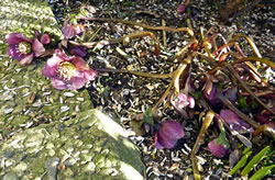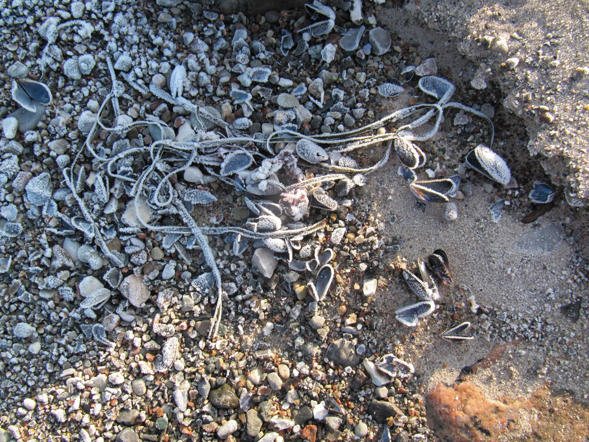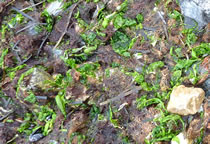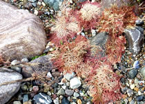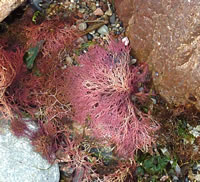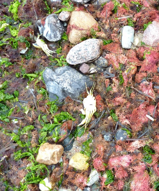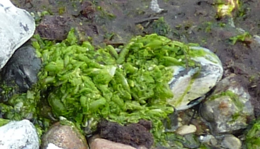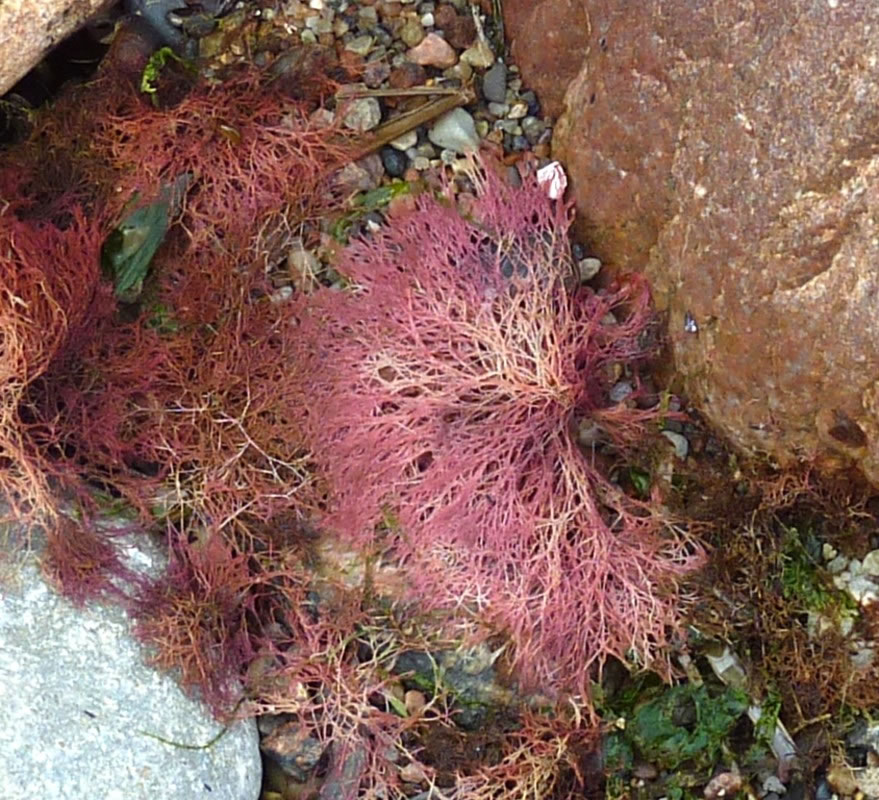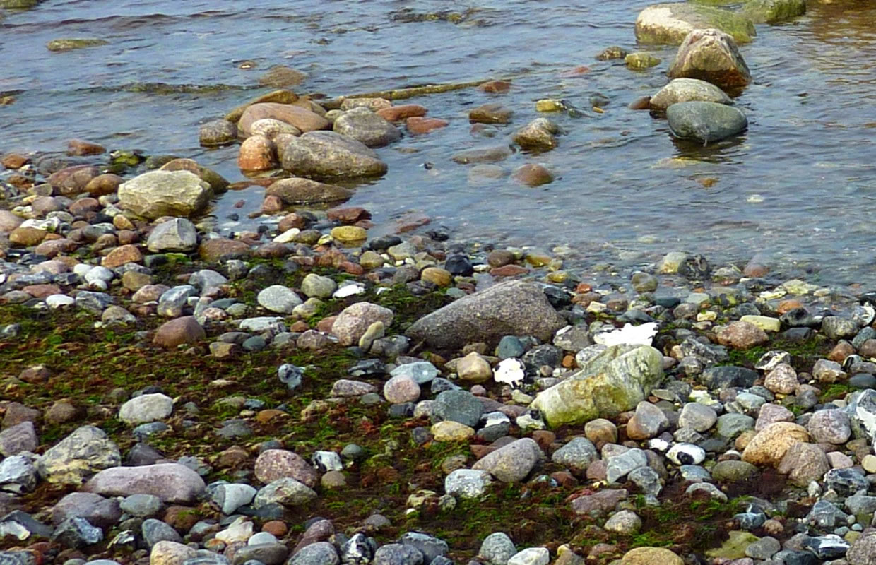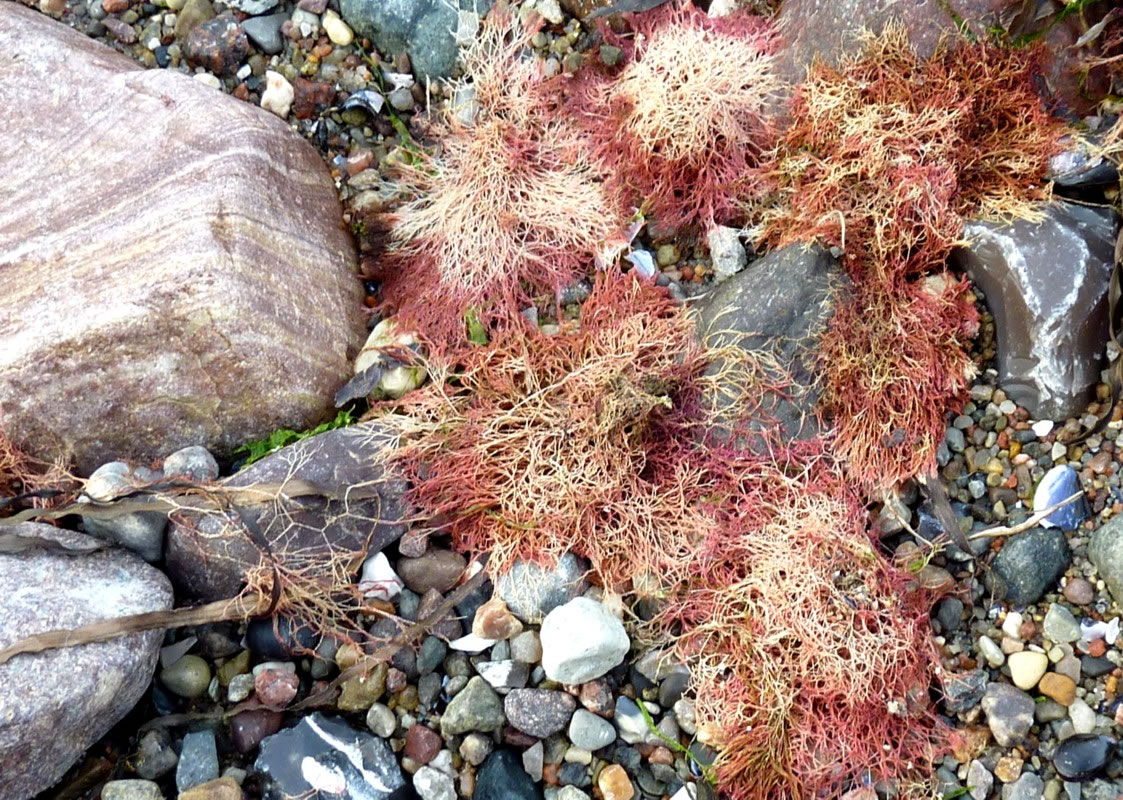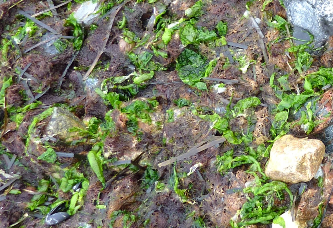 Dat müssen wi uns doch wat genauer ankieken. "Dat is wieder nix as frisches Seegras", meen mien Mann. Ik heff dat aver genauer ünnersööcht. De düsterroden Planten weern ganz besünners smuck. As ganz fines un zortes Astwark legen de dor dicht an dicht in den Sand. Dorvör, noch meist in't Water, legen mank de Steen gröne Planten. De erinnern mi an frischen Salat.