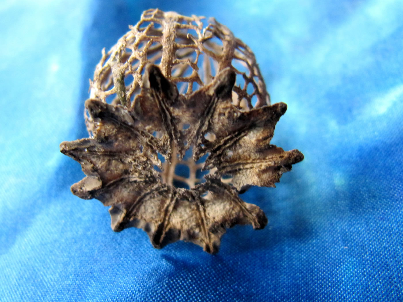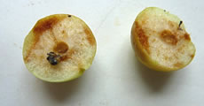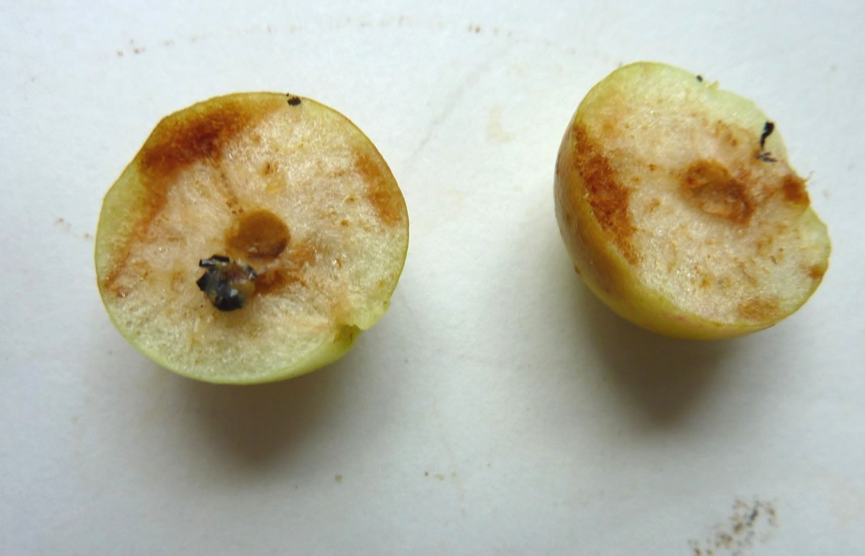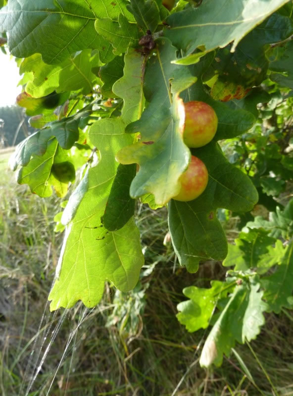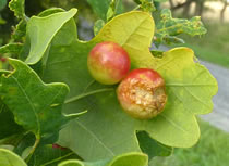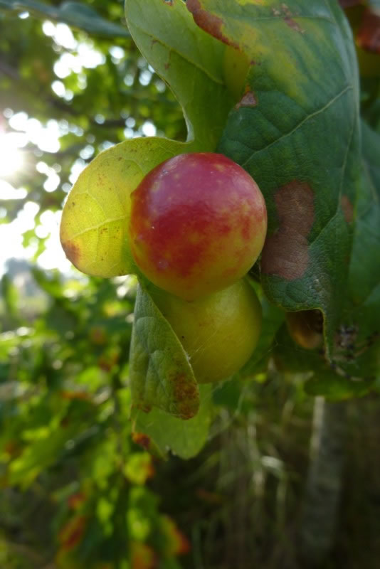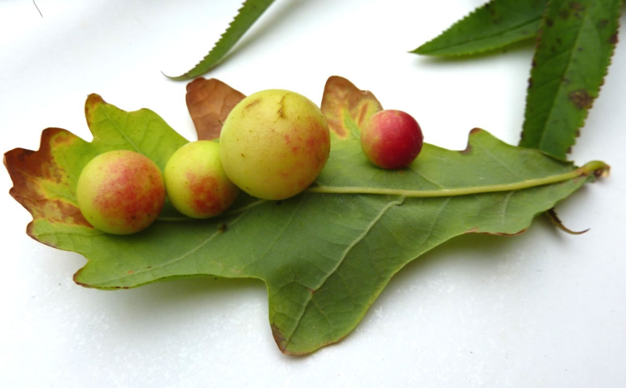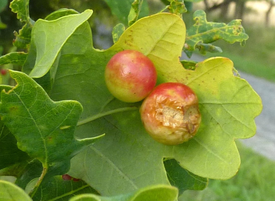 En Blatt mit veer Galläppel heff ik afplückt un mit na Huus nahmen. So'n Gallappel müss ik genauer ünnersöken. Ik heff em mit en scharp Mess uteenanner sneden. Genau in de Meern vun den Gallappel seet en lüürlütt Laarv.