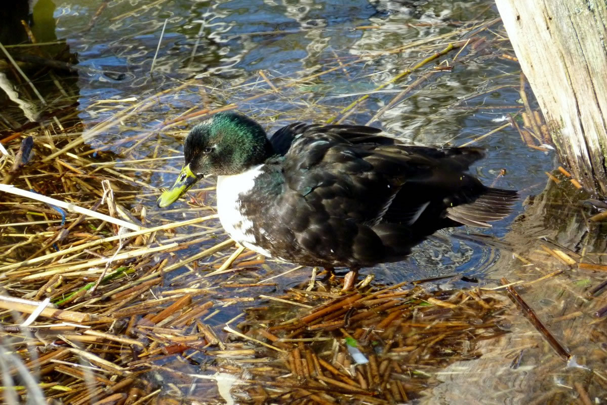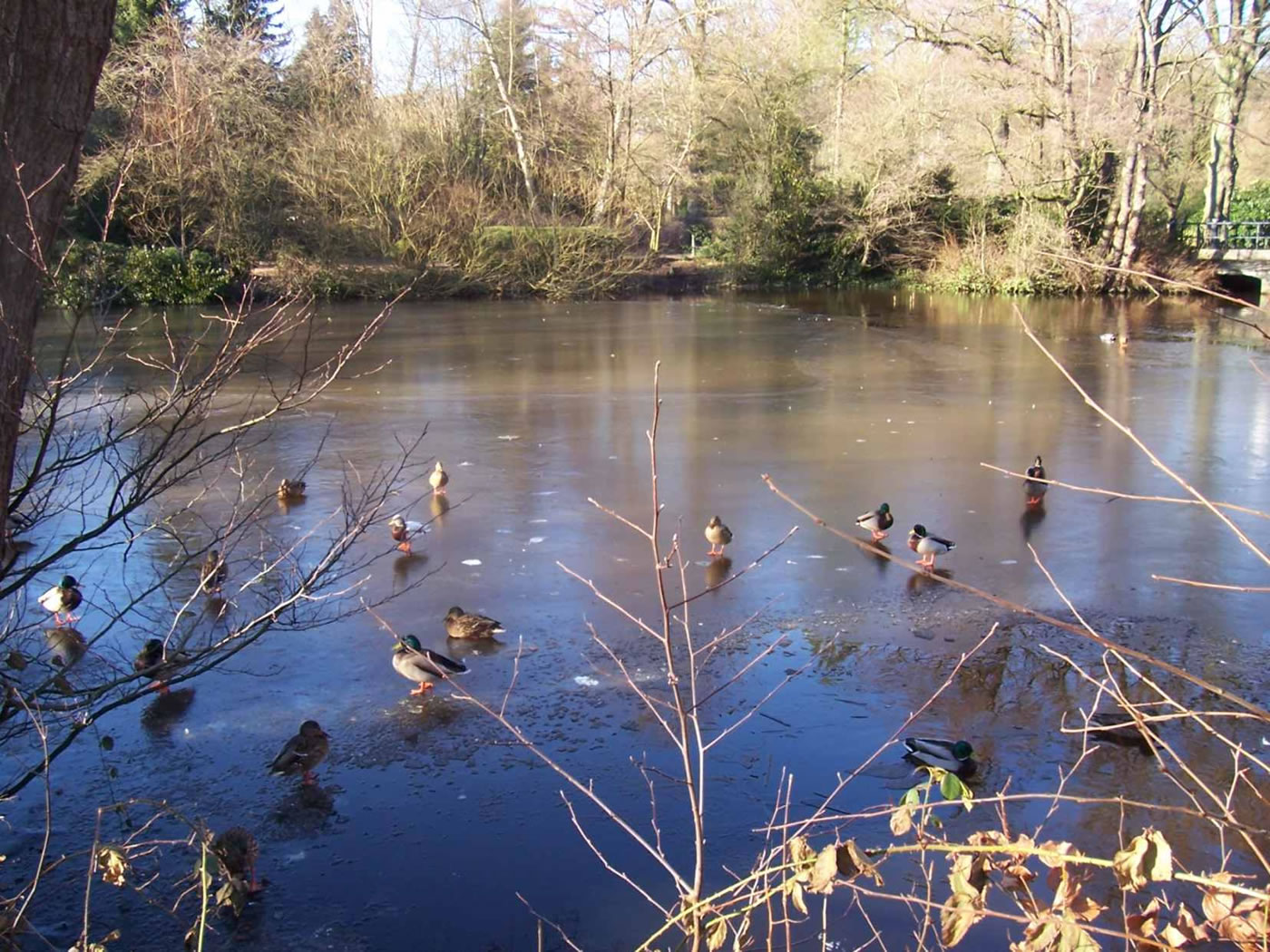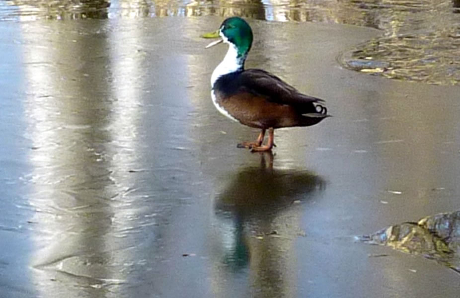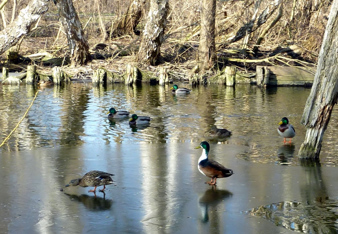 Glieks kemen welk answommen un kladdern ok up dat Ies. Dat weer en fröhlich Gesnatter. Immer mehr Aanten kemen an. Welk weern al an't Gründeln. En Aantenfru bleev aver lever up enen Reethupen in de Sünn. Se blinzel mi an, as wull se seggen: "Mi is dat Water noch to koolt!"