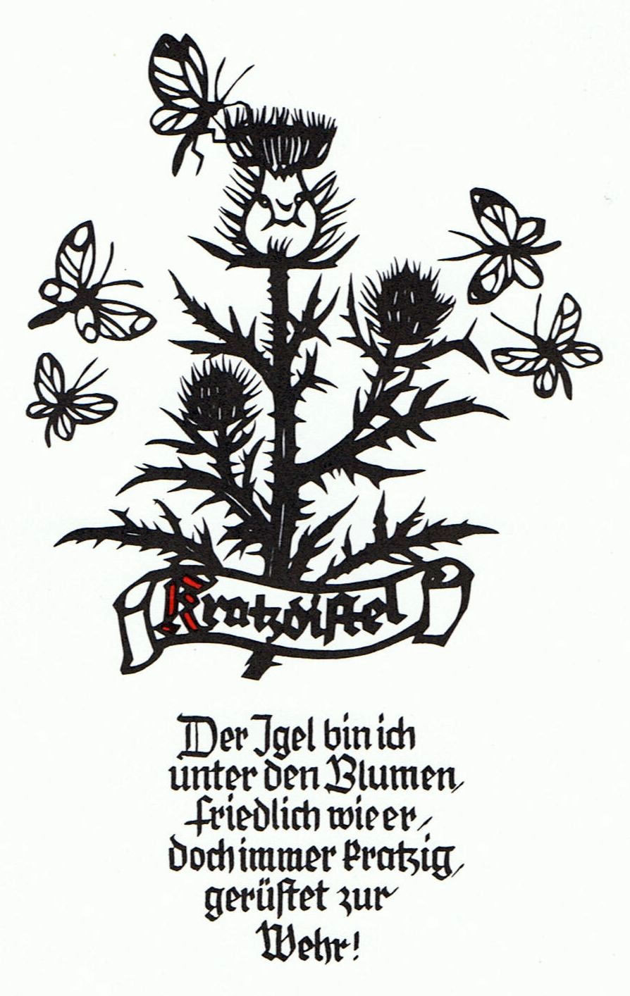 Fründin Annekathrin hett mi ene olle Plischke-Kort schickt. Se wiest ene Distel, un ünner de Distel steiht: "Der Igel bin ich unter den Blumen, friedlich