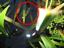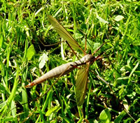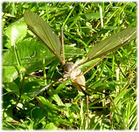 "De Sommer is bald vörbi. Ik mütt maken, dat ik mien Eier in de Eer krieg", dach de Snakenfru. "Sünst köönt düssen Sommer keen Larven mehr ut de Eier krupen!" Dat weer en swoor Stück Arbeit. Se müss ehr'n Legebohrer deep in de Eer purren. In dat Lock kunn se denn de Eier afleggen. De letzten Daag harr dat düchtig Regen geven un de Bodden weer noch natt. Hüüt weer dat dröög un de Sünn schien. Dat weer de richtige Dag. Se flöög över den Rasen hin un her. Endlich harr se den richtigen Placken funnen. Deep purr se den Achterliev mit den Legebohrer in de Eer. Nu kunn se ehr Eier afleggen. Na de Arbeit bleev se enen ganzen Stoot mööd up den Rasen liggen. Se harr ehr Wark daan, se harr för de Nakamen sorgt. De Biller köönt Se per Klick