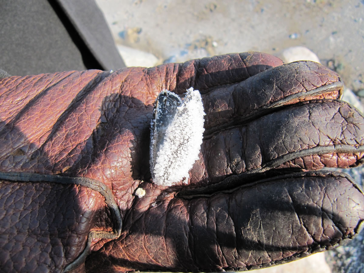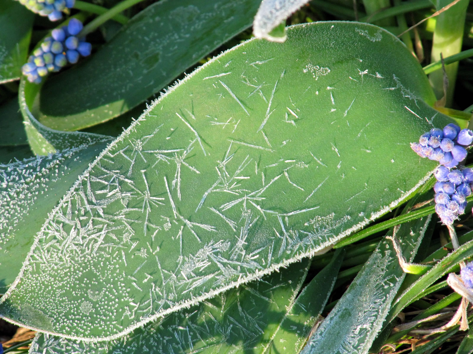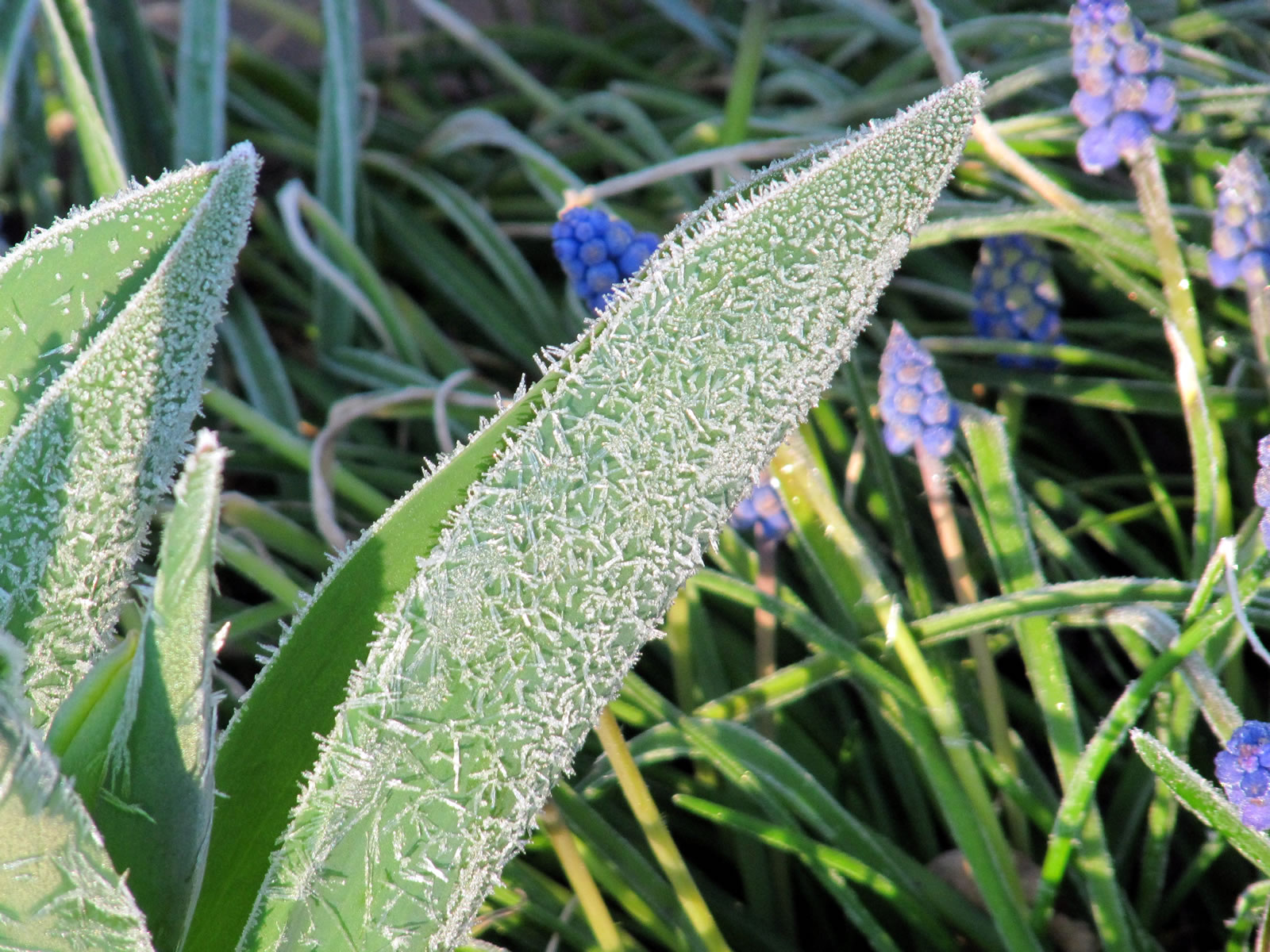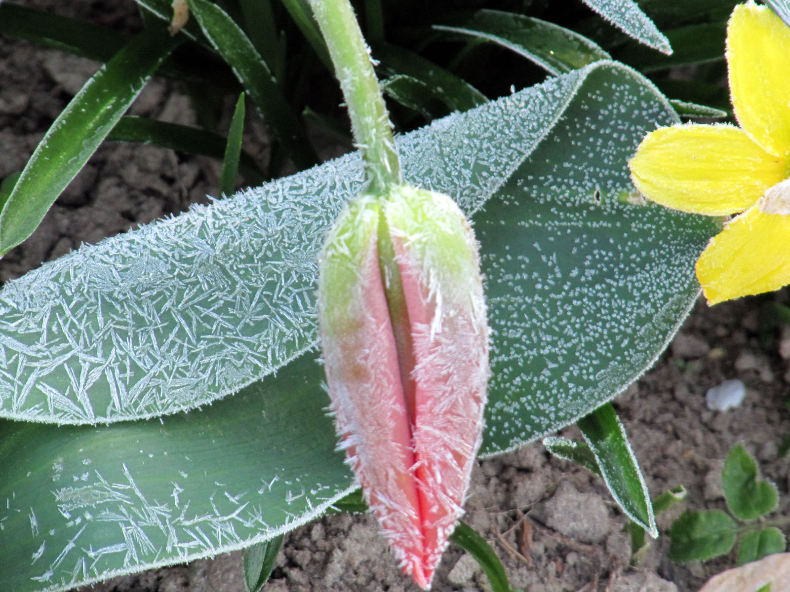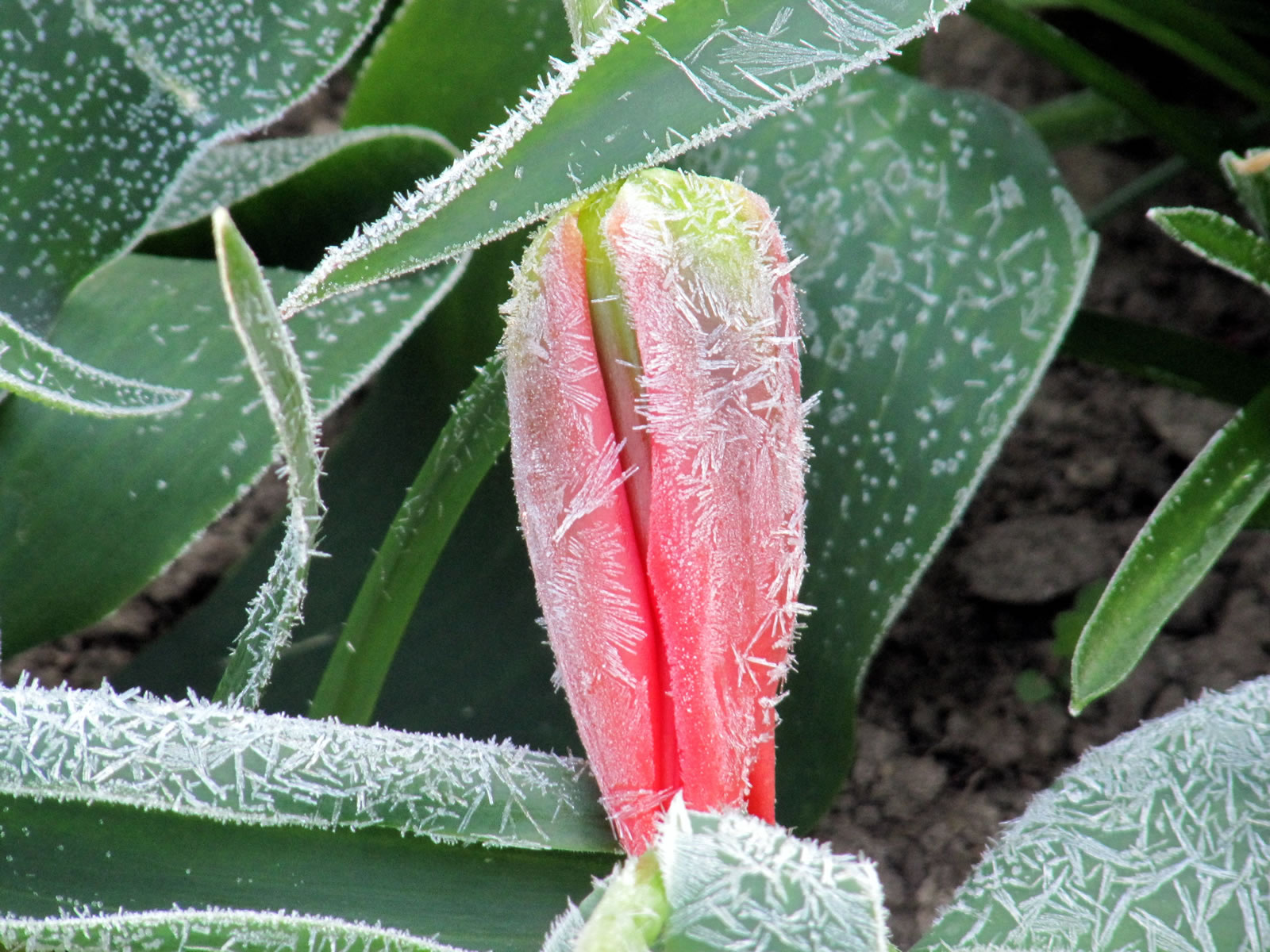 Hüüt, an'n Karfriedag, weer ik morgens al fröh naja so Klock söven buten. Uns Thermometer wies 4°C minus. Kunn ja wohl meist nich angahn. Man, de Rasen weer witt. Un uns Blomen? Oh, oh Väterchen Frost harr se all besöcht. He hett up ehre Bläder Muster tekent, togeven: hübsche Muster. De Tulpen hett he daldükert, dat vele Blöden an de Erd liggt. De Narzissen hett he witte utzackt Iesränder an ehre lüchen gele Blöden tövert.