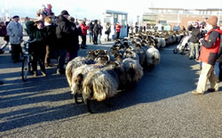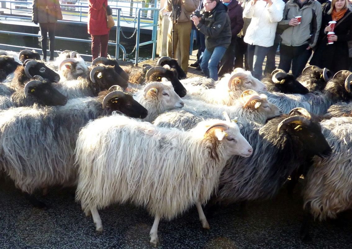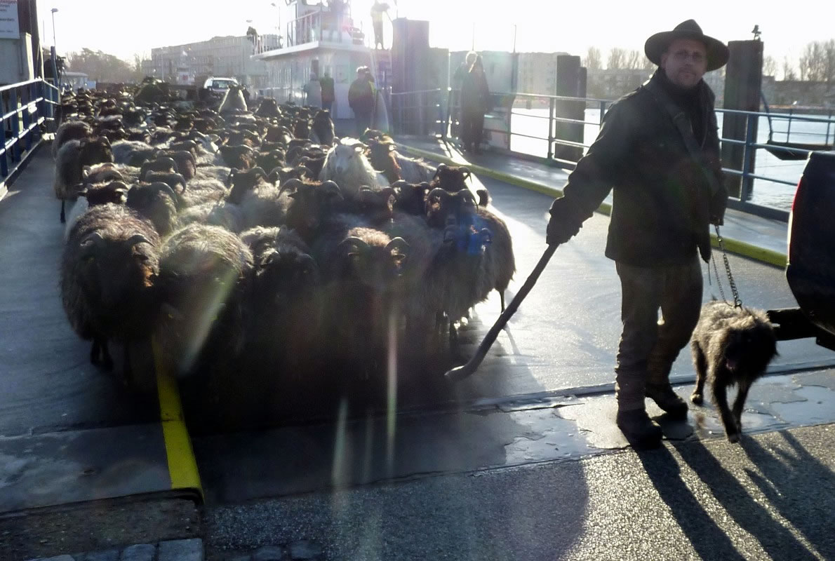 Denn weer dat sowiet. Schöön vörsichtig legg de Fähr "Schleswig-Holstein" an den Anlegger an. Ganz vörut föhr en Polizeiauto mit Blaulicht vun de Fähr. Dat möök den Weg för de Schaap frie. Liekers harrn de Schaap vör de velen Minschen an't Över Schuuch un bleven stahn. Eerst as de Scheeper mit sien Stock un sien beiden Hunnen keem un de Schaap toreep: "Komm, Alte, komm!", güng dat wieder.