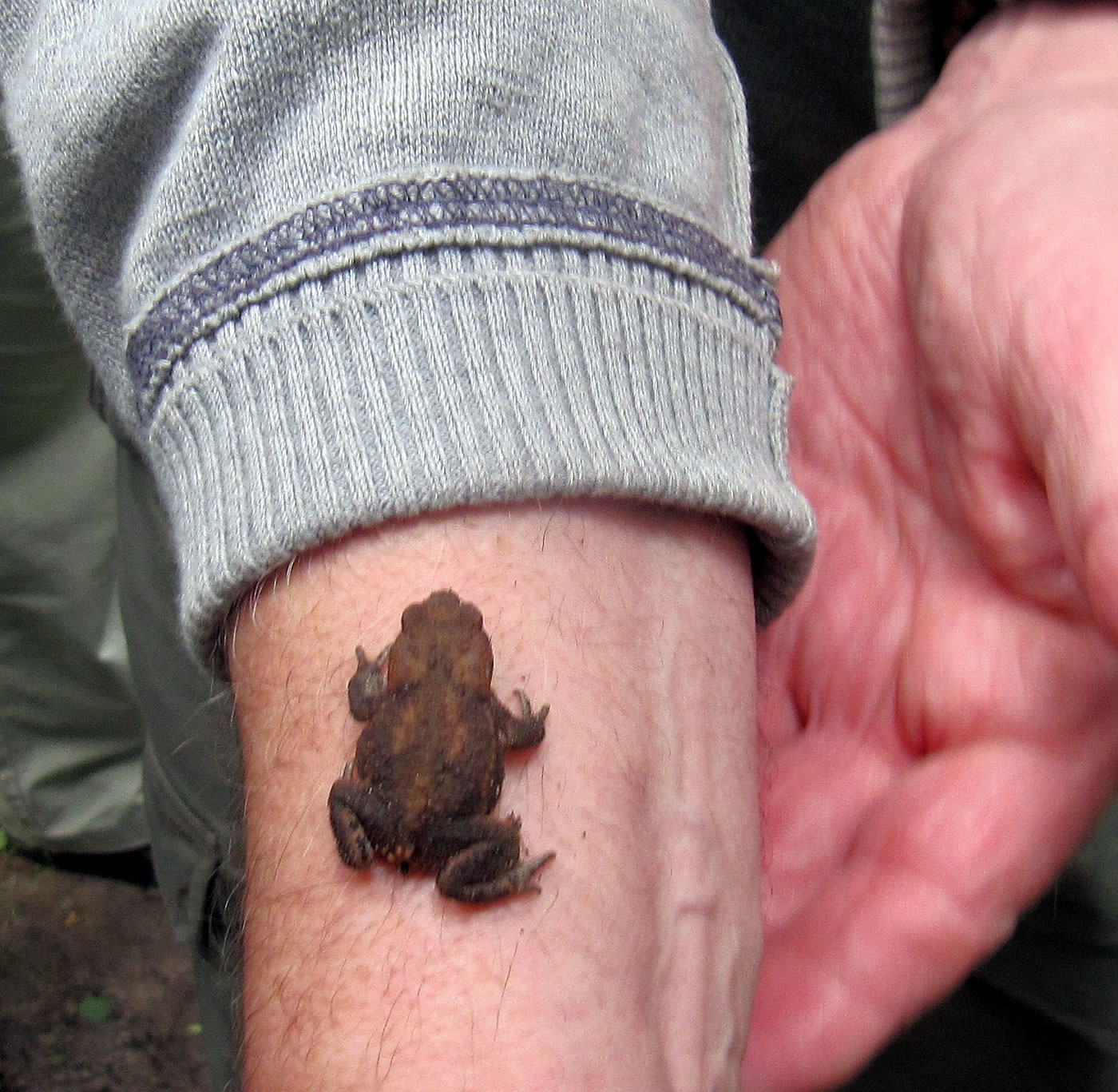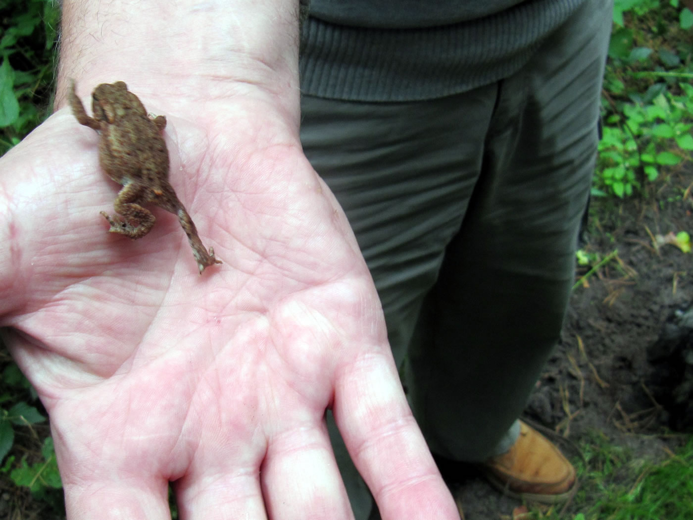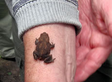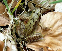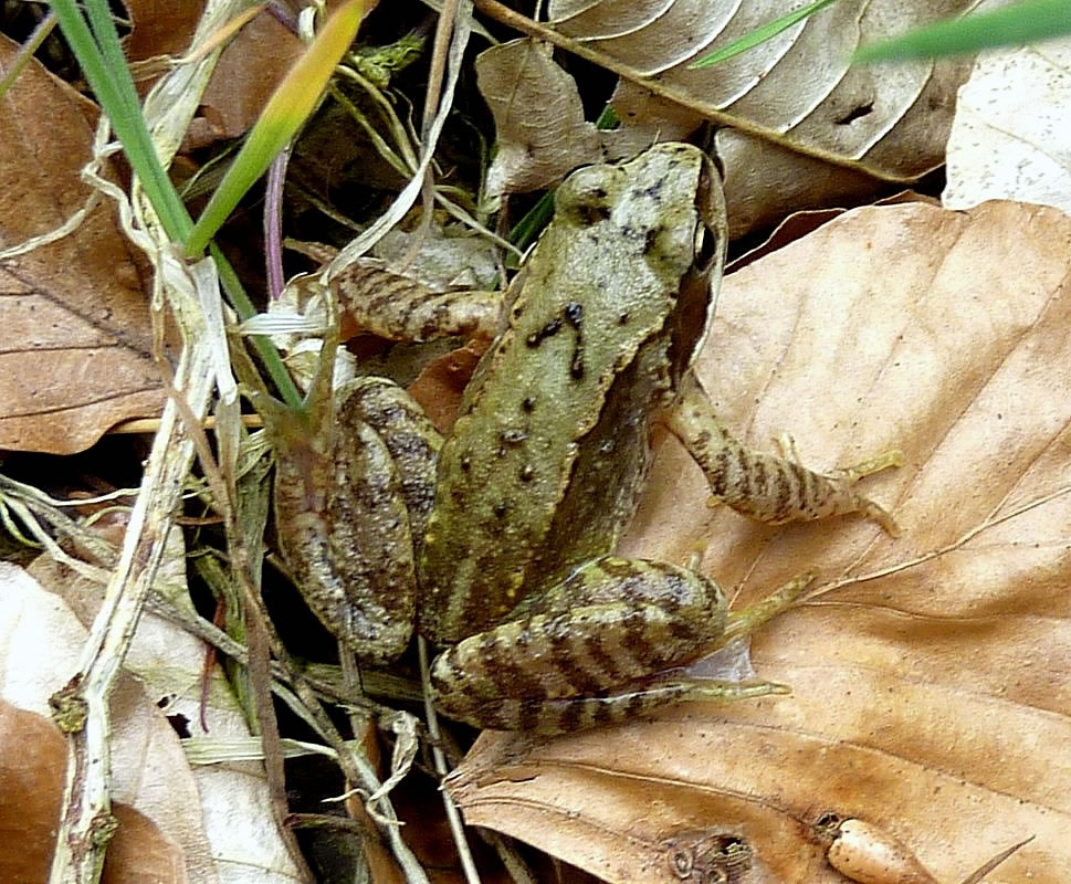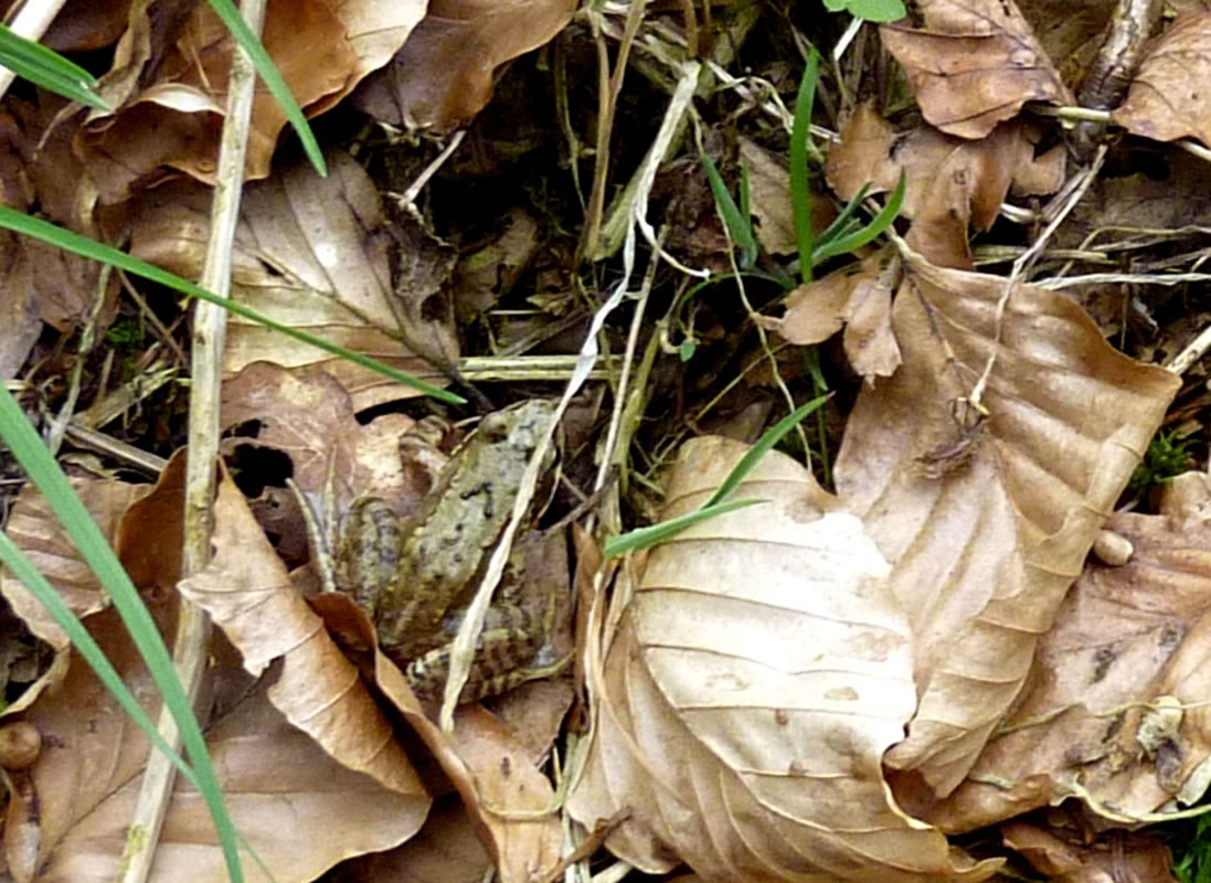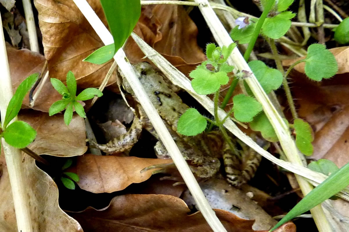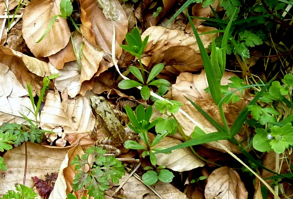 30.4.12 . .Rana en echten Pogg! Wat weer ik verwunnert över de Utkunft vun den lütten Pogg, den ik tofällig funnen harr! Dat weer en echten Pogg (lat. Rana)! Gifft dat ok unechte Poggen? As ik letzten Sünndag mit mien Mann mit Auto dörch den Woold föhr, wöör ik an den Rand vun en Waldweg de ersten Mööschen wies. Glieks heff ik anhollen, dat müss ik genauer ünnersöken. Un wohrhaftig, an de Kannt vun den Weg wussen n'Barg Mööschen up en lütten Wall. Dor müss ik mi doch enen lütten Struß plücken un mit na Huus nehmen. De drögten Mööschen legg ik ümmer in mien Wäscheschapp mank dat Linnentüüch. Dat rüükt so goot. As ik up den Wall kladder un mi na de Mööschen bück, hüpp mi en lütten Pogg meist in't Gesicht. Ik heff mi böös verfehrt. Den Pogg harr ik wull ut sien Meddagsslaap haalt. He hüpp mank dat verdröögte Loof un dörch de Mööschen vör mien Fööt. Denn sett he sik up en Blatt. Gau haal ik mien Knipskassen ut de Tasch. Aver dor weer de Pogg al wieder hüppt. Endlich wöör ik em wedder wies. Aver in den Momang, as ik up den Utlöser drücken wull, swupp!, hüpp he al wedder wieder. Ik ümmer achterna. Dat güng den Wall up un daal un duer so lang, bit ik in't Gras full. Mien Mann müss mi wedder hoochtrecken. Nahdem ik mi dat Loof un de Dannennadeln vun de Büx kloppt harr, fraag he: "Hest denn nu wenigstens en godes Bild vun em maakt?" "Dat weet ik doch noch nich, ik mütt eerst mal nakieken!" As ik em denn up dat Display vun mien Knipskassen den Pogg wies, meen he: "Dat hett sik ja richtig lohnt! Dat is ja en ganz besünneres Exemplar!" Ja, dat weer en echten Pogg, en Moorpogg! De Biller köönt Se per Klick