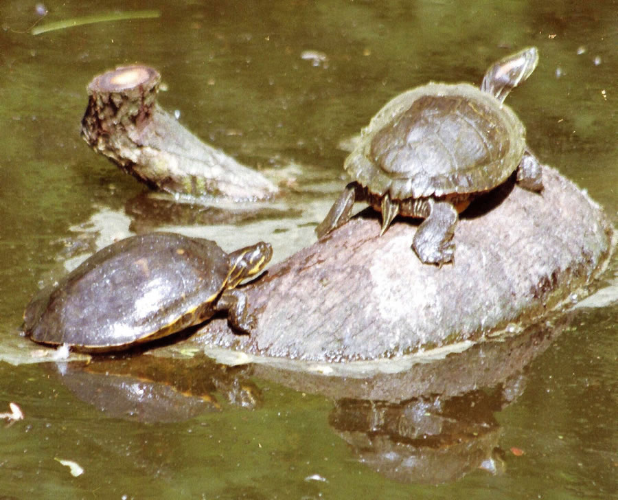 19.9.10 . .Een lütt bääten Bott an de Sünn Över Dach sünd de Söötwoater- un Unlandschildpattkrötjis in de Gödenser Schlöttgraft riep föör dat Eiland. Hier an disse Stää köänt sükk de wesselwaarmen Uurtiedsdeerten up Boomstammen, de in d Woater lirgen, van de Sünn upwarmen loaten. Eerst wenner de Füürbaal an d Hääven achter de Bööm van d Schlöttpark wächdüükt is, worden de Deerten krägel un scheeten dör de Schwemmhuut tüschen hör Toanen as Pielen dör d Woater achter anner lütji Futterdeerten an, de see mit Gewalt frääten willt. De licht footlangen Uurtiedsdeerten hevvt ok keen Manschetten vöör gröttere Fischkers, de see van achtern un an d Ünnerliev eers mit Bieten attakkeern un denn verhakkstükken. De Schildkrötjers hevvt woll keen Tannen in d Bekk, oaber netso as Opa up Felgen gnaueln dee, wenner he sien Gebitt verlüstich goahn wee, netso scheert disse Kloogkoppen dat Fleeschk bi de annern van de Rirbens un lüttgern dat mit hör Vöörpodjis bevöör see dat denn fräten. Dat Fräten geit jümmers ünner Woater av, worbi see sükk nich blods Fleeschk achter de Kusen neien, sünners ok Woatergrööntüüchs steit up hör Spieskoart. Winterdachs sööken de Urtiedsdeerten vöör de brannige Koal schloapend Schuul in de morastige Woatergrund. Wenner dat eerste Maigröön in d Joahr vandach kummt, denn fieren de Deerten Hochtied. Een lütten Sett loater spittet dat Wiefken mit de Achterbeenen een Lokk in de Grund, in dat Stükk ov wat bit twintich Eier trüllern, de see glieks mit Eer bediekt un sükk denn an niks mehr keert. Noa tachentich bit hunnerdtwintich Doagen (dat kummt up dat Wäär an) krupen de lütji Deerten ut de Eierschilln un mooten van de eerste Minüt an allennich tosehn, dat see dör de Tied koamen. De Schildkrötenliev sitt in een Panzer ut Schildpatt, de ünnern un boaben Lokken föör Beenen un Liev hett. Us Omas, de stooken ok noch in sükke Korsoajen, de see sükk woarschiens bi de Schildkrötjis ovkääken harn. Wenner de Lücht üm hör to nich heel schoon is, dat heet, wenner hör een an d Liev will, denn trekken see Beenen un Kopp trüch un ut d Verkeer, worbi de Steert sass an een Achterbeen anlächt ward.