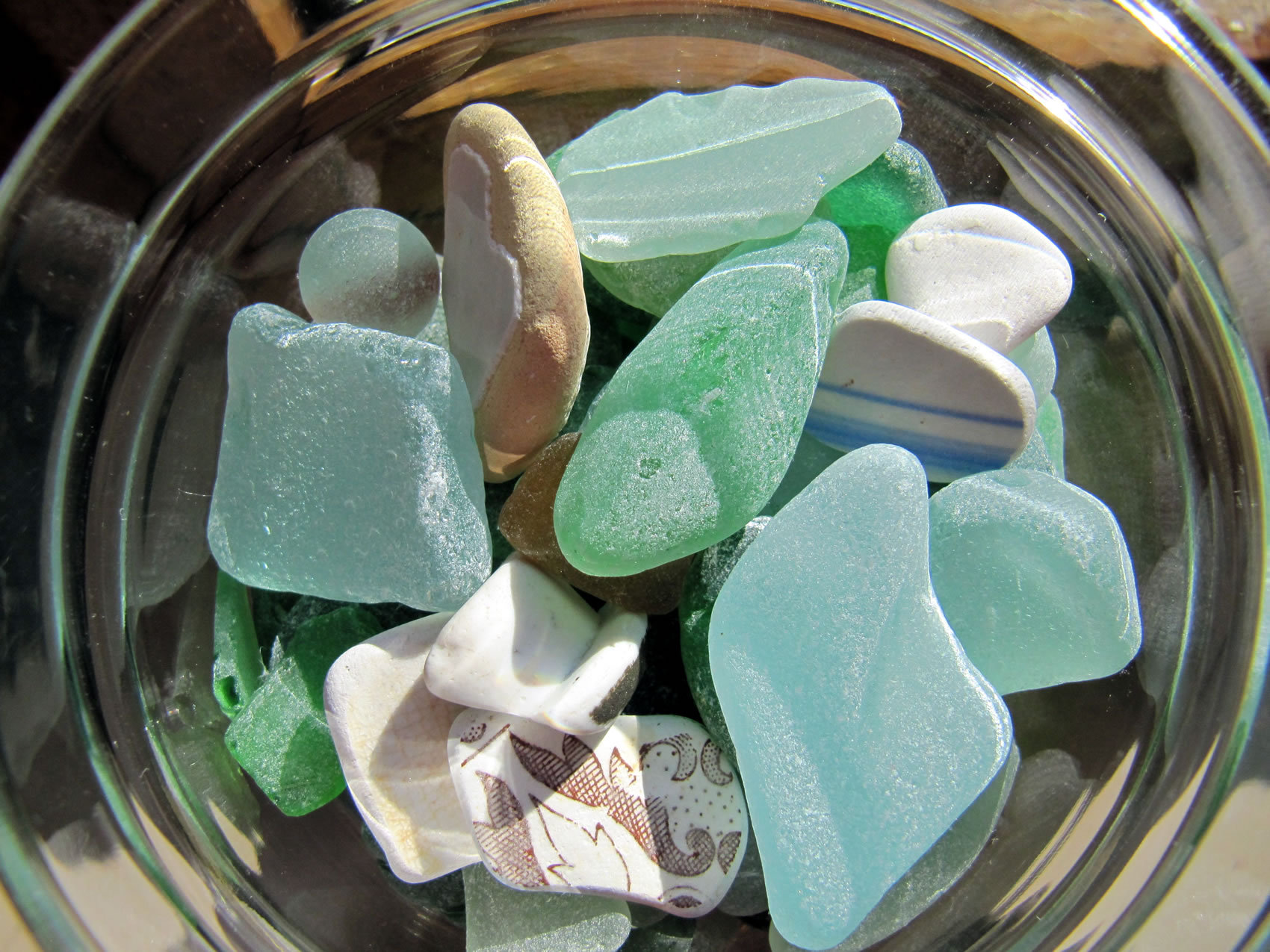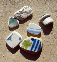 He hett ja Recht, mien leef Mann, ik gah dorüm ok veel lever alleen an't Water lang un freu mi an allens, wat dor so rümliggen deit, as Muscheln orrer Steen orrer ok an Schören. Mehrst sünd dat Schören ut Glas, blaag, gröön, witt, bruun. Bi de brunen Schören krieg ik elkeenmal enen lütten Kick: "Sull dor en Stück Bernstein liggen?" Man nee, mehrst is dat weller en Schöör. Un wiel de Glasschören in't Water vun de Wellen jümmers hen un her beweegt warrt un dor denn bi över den Grund schraapt, sind de Stücken all glatt un rund un fein in de Hand to hollen. Un so'n Stück kann ik denn doch nich liggen laten! Dat mütt doch jedereen insehen. Na ja, togeven, ik heff tohuus en ganz Glas vull mit Schören aver ik freu mi jümmers to elkeen nieget Stück. Wenn ik dat Glasstück an'n Strand find, denn is dat natt un lüücht so'n beten. Wenn dat Stück denn dröög is, wenn dat also hier bi uns up't Schapp in en Glas liggt, denn sünd de Stücken wat stuff, matt, licht witt. Glänzen doot se denn nich mehr. Ok Keramik-Schören heff ik al funnen. Un denn kiek ik mi de Muster an un sinneer, to wat för'n Gegenstand disse Schöör wohl mal höört hett un woso disse Pott wenn't denn en Pott weer wohl in't Water kamen is. Dor kannst di denn wunnerschöön Geschichten to utdenken. De Biller köönt Se per Klick