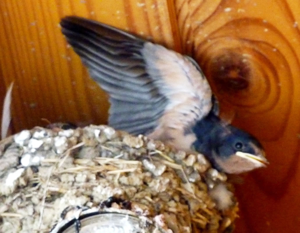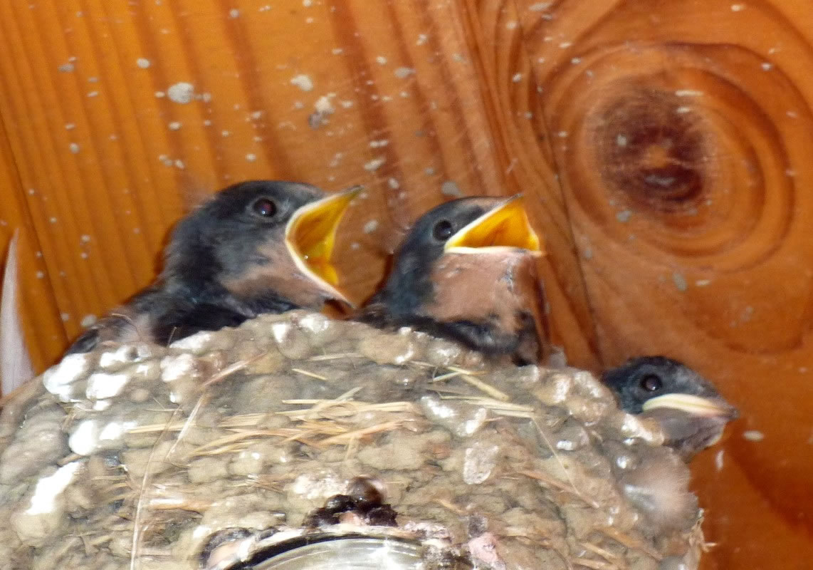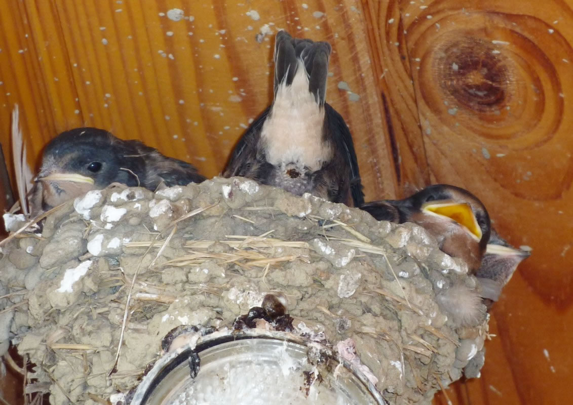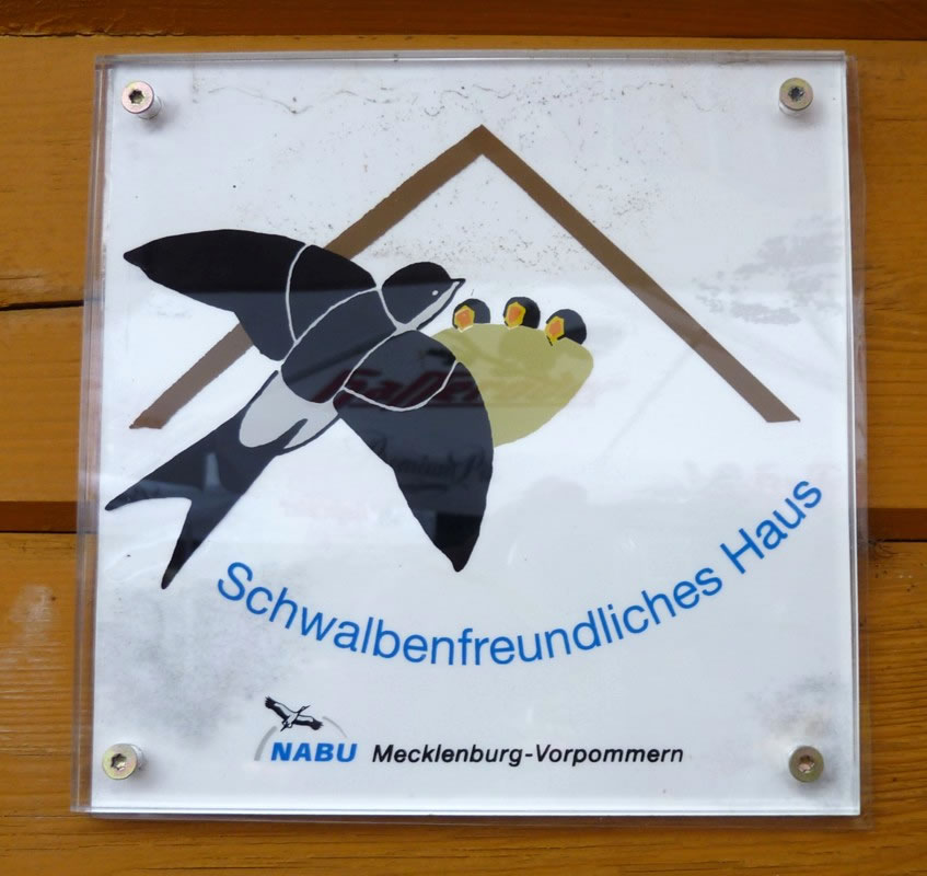 "Schwalbenfreundliches Haus NABU Mecklenburg-Vorpommern". De jungen Swulken weern al teemlich groot. Se breedten al mal de Flünken uteenanner un öövten dat Flegen. Ünner dat Nest harr de Gastwirt en Brett anbröcht. Dat weer ok nödig. De Lütten höllen ehrn Steert över den Nestrand un möken ehr Geschäft. In hogen Bagen keem de Schiet anflagen. Eenmal heff ik sogor wat up de Jack kregen. Ünner groot Gelächter vun de annern Gääst heff ik mi wedder sauber maakt. Heff dorför aver ok gode Biller vun dat Swulkennest knipst. Unsen Besöök in dat Café Strandgoot weer en groten Erfolg! De Biller köönt Se per Klick