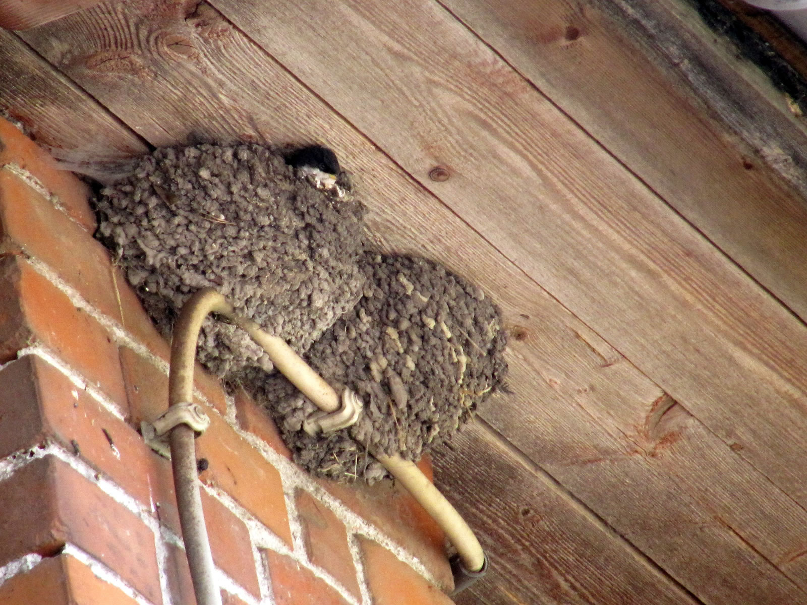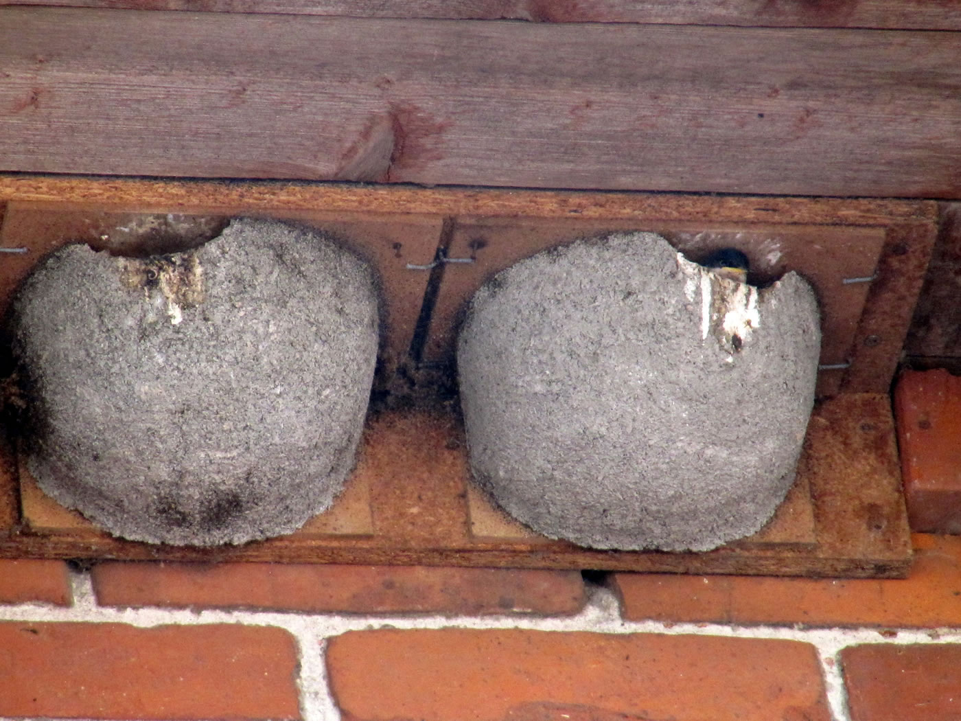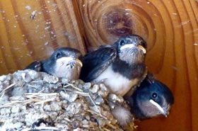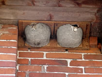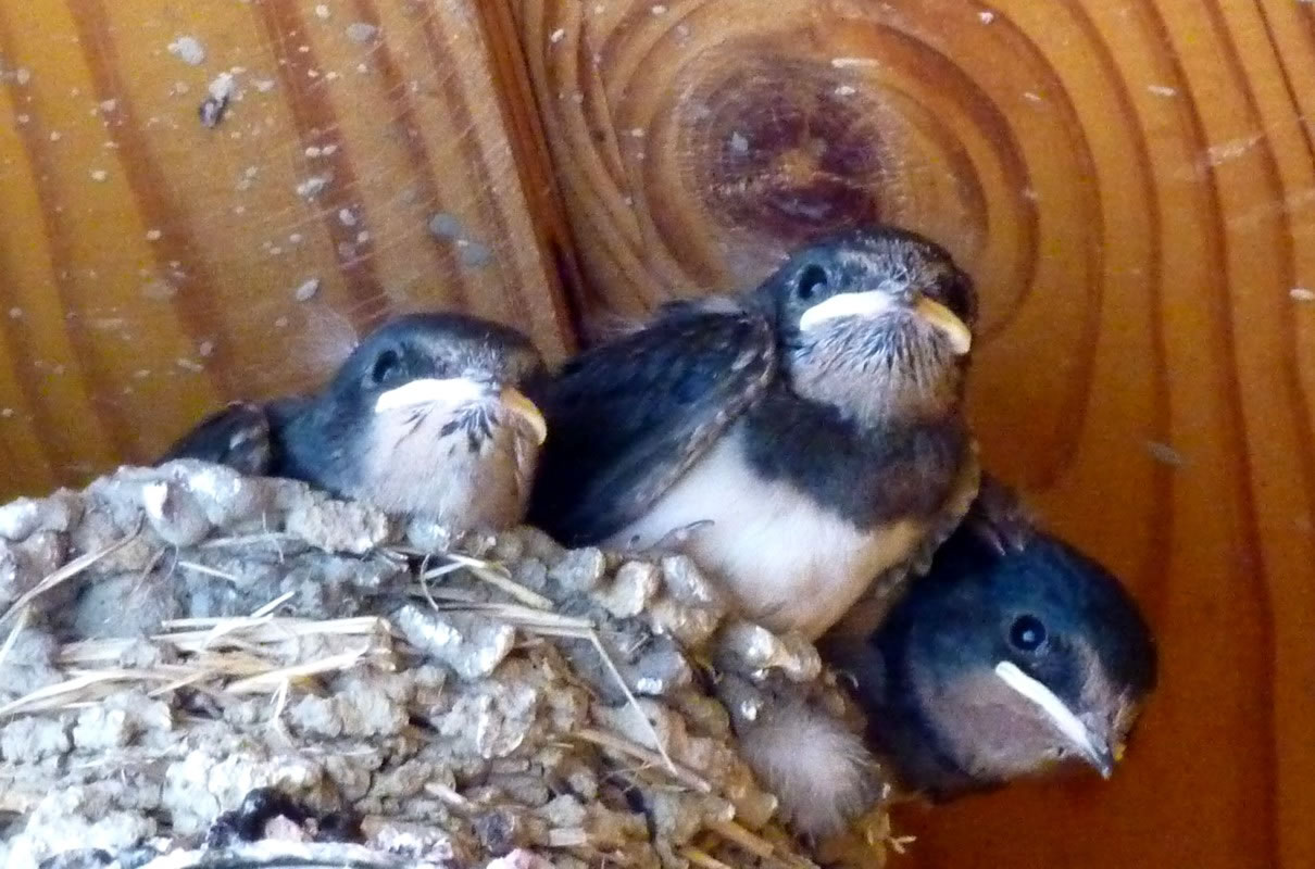 "Schwalbenfreundliches Haus NABU Mecklenburg-Vorpommern". De jungen Swulken weern al teemlich groot. Se breedten al mal de Flünken uteenanner un öövten dat Flegen. Ünner dat Nest harr de Gastwirt en Brett anbröcht. Dat weer ok nödig. De Lütten höllen ehrn Steert över den Nestrand un möken ehr Geschäft. In hogen Bagen keem de Schiet anflagen. Eenmal heff ik sogor wat up de Jack kregen. Ünner groot Gelächter vun de annern Gääst heff ik mi wedder sauber maakt. Heff dorför aver ok gode Biller vun dat Swulkennest knipst. Unsen Besöök in dat Café Strandgoot weer en groten Erfolg! De Biller köönt Se per Klick