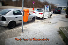 Wohld güng unsen Weg. Up den Parkplacken vun dat Café
