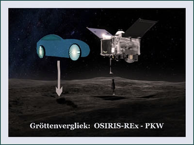 van Ludgerd Lüske Mit OSIRIS-REx will man rutfinnen, woher wi Menschken kaomt un wat use Rulle in dei Welt is. Asteroide bestaoht ut äöwer bläben Schutt bi dat Entstaohn van dat Sünnensystem. Dei käönt Künne bringen tau dei Geschichte van dei Sünne un dei ümloopen Planeten. TAGSAM heit dei Probennähmer-Gelenkarm van OSIRIS-REx, dei an't End einen Upnaohme-Kopp dräg. Bi dei Up-un-Aff-Aktion langt dei Arm nao den Bodden van Bennu. Dei Ruumschipp-Impuls drückt den Upnaohme-Kopp dorbi rund fief Sekunnen lang up den Asteroid-Bodden, jüst lange naug för ein Probenähmen. Bi den Bodden-Kontakt blaost Stickstoffgas binnsiete van den Kopp up den Bodden. Stoff un lüttke Steinkes werd hoch puußt. An dei Kante van den Kopp werd dit wegfleigen Wark in eine Kring-Kaomer upfangen.