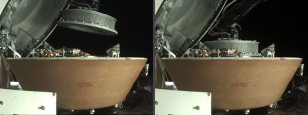 Dei OSIRIS-REx-Mission van dei NASA hätt den Ruumsonden-Probensammel-Kopp in ehre Proben-Trüggbring-Kapsel (SRC) settet. Dat eierste Bild wiest den Kollektor-Kopp, dei äöwer dei Kapsel schwäwt, naodem ein Arm üm in dei passen Laoge för dei Upnaohme bewägt hätt. Dat tweide Bild wiest den Kollektor-Kopp, faste maokt an den Upnaohme-Kring in dat SRC. Beide Bilder nöhm dei StowCam-Kamera up.