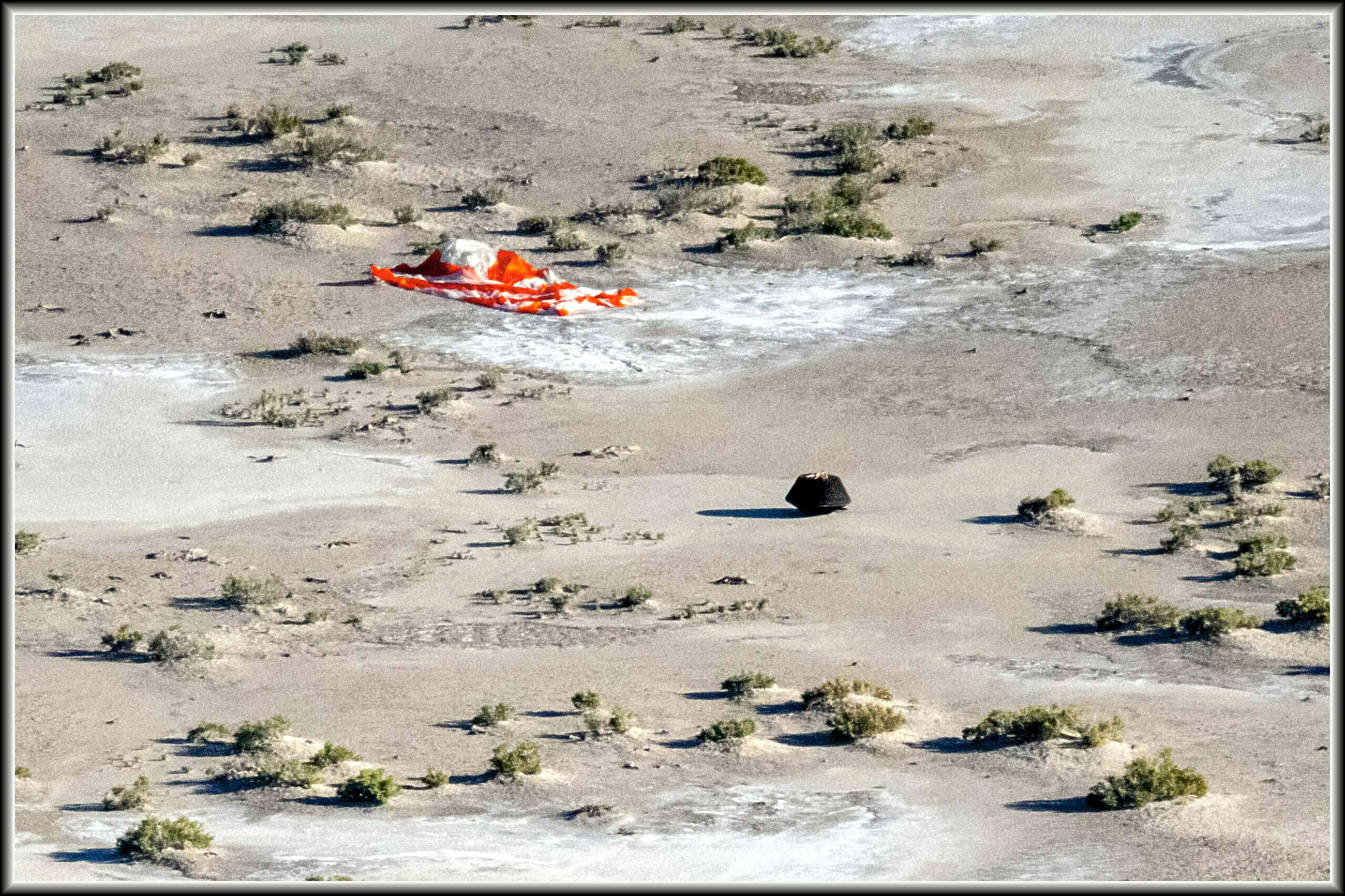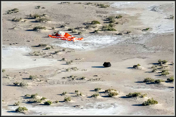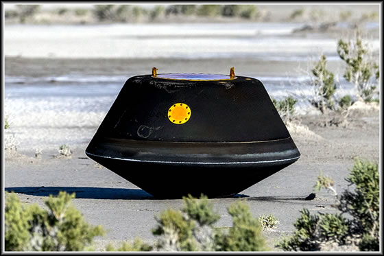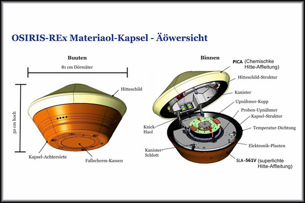 Hier is dei Kapsel an ehr Landestäe tau sehen. Sei was an'n 24. September mustergüllig in dei Wööst van Utah landet, as dat plaont weer. Dei NASA-Forschkers fünnen schwarten Stoff un einen Bült van braoken Steinkraom up dei Elektronik-Plaoten in den Wätenschkup-Kanister, at man den Deckel affnöhm. Den Kanister in dei OSIRIS-Rex-Materiaol-Kapsel bröchde man an'n 25. September nao dat Johnson Weltruum-Zentrum in Houston.