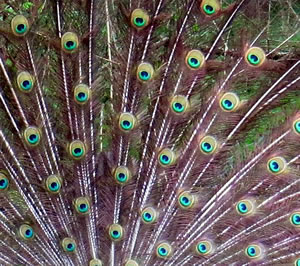 Steertfeddern Ogen up maalt. Irisierend Ogen. Dat Irisieren is vun