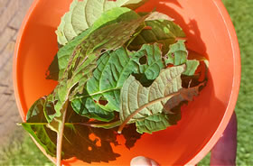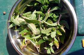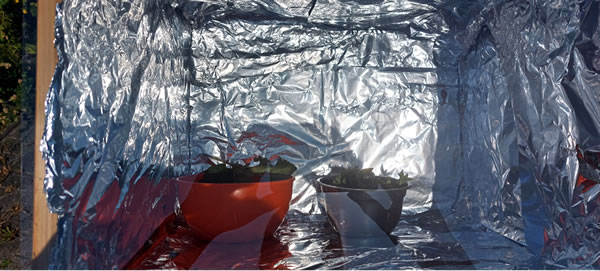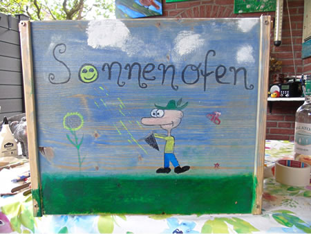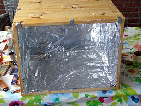 Vör de apen Siet warrt noch en Plexiglasschiev monteert. Plexiglas kannst ok heel good bearbeiten un denn jichenswie bündig maken, dat an de Sieden nich to veel Warms verlarengeiht. Op't best kannst de Schiev mit Metallwinkel fastklemmen. Schöön dicht un togliek licht optokriegen. Fertig. Se ahnt dat al: Düt is en Döör- un Dröögaven. Wenn du den na de Sünn dreihst, hett de Aven binnen in Nullkommanix 70°C. Ik will düsse Krüder drögen un Tee dorvun maken. Dat sünd Minze un düsse japaansche Teehortensie. De Minze is heel aromatisch, anners as de ut't Reformhuus, veel intensiver. Aver ok lecker. Kannst aver ok Petersilie orr Aavt in den Aven drögen. Allens even, wat geiht. De Krüder kaamt in lütte Schötteln. De Schötteln kaamt in den Aven, de Plexiglasschiev kümmt dorvör, un denn laat ehr brutzeln!