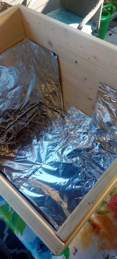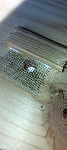An een Siet (nich gegenöver de apen Siet, sünnern dorblangen!) bohr ik Löcker un deck ehr mit Flegengitter af. De Löcker sünd to'n Entlüften, avers dor schallt keen Insekten rinkrupen. Dorüm nehm mööglichst fienes Flegengitter. Mit'n Kleevpistool un lütte Holtleisten warrt dat Flegengitter över de Löcker fastmaakt.