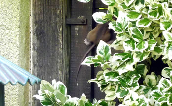 Nu müss ik aver doch mal nakieken. As ik upstünn sprung wupps de "Dacklünk" ut de Ampel an de Lattenwand. Dat weer würklich en Muus! Dörch en Ritz mank de Latten weer se glieks verswunnen. Ik kunn blots noch de Achterbeen un den langen Steert wies warrn.