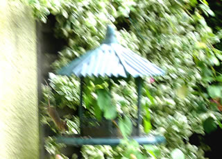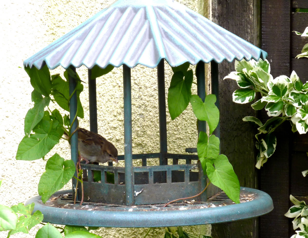 Musenstill seten wi nu up uns Stöhl un töven up den neegsten Besöök vun de Muus. Dat duur natüürlich en ganzen Stoot. Aver denn beweg sik dat Loov an de Lattenwand un de lütte Kopp mit de swatten Knoppogen vun den Spitzboven kemen to'n Vörschien. Denn hangel sik de Muus an de steile Terrassenwand na ünnen. Mit enen riesigen Satz sprung se över den Afgrund up dat Gitter vun de Vagelampel. De schaukel richtig hin un her. Denn leet de Muus sik dat goot smecken.