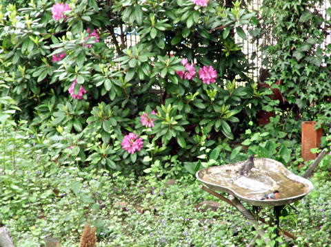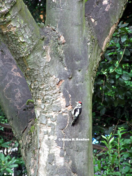 Achter unsen Huus is en groote Wisch mit verscheden Bööm, as Eberesche un Ahörner. Un so is dat nich utbleven, dat hier etliche Vageloorten, Kaninken un Katteker sünd. Op den Rasen sünd verscheden Blööm, ik heff hier immergröne Büsch, Doodholz un Kiefernzappen för de Insekten, un vörn un achtern lütte un groote Pött för de Vagels un Insekten to'n Drinken un Rümplantschen.