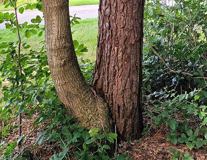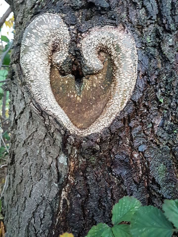 Trüch to unsen Boom. As wi hört hebbt, is he hart. He wiest aver uk Hart. Wokeen dat nich glöövt, de schall sik disse Biller mal ankieken. Mien Fro hett den rechten Blick för solk Dingen. En good un gesund opwussen Boom steiht stolt in de Landschop. Nich wiet dorvun af en Boom, de vör Johren al mal piesackt worrn is. Wohrschienlich weer en Telgen nich so wussen, as en Minsch sik dat dacht harr. Viellicht hett em de Telgen ja ok den Weg afsparrt, dorüm müss he weg. Eendoont, de Telgen worr afsoogt un na bleev en Wunn, de sik ganz langsam eerst wedder vernarven müss. Dorbi hett de Narv en Afbild vun en Hart nalaten. Dat sik Bööm vun ünnerscheedlich Oorden goot vergahn köönt, mag dat Bild vun den Eekboom un de Föhr wiesen. Vun lütt op an sünd se tohoopwussen. Emigratschoon schient hier keen Thema to ween.