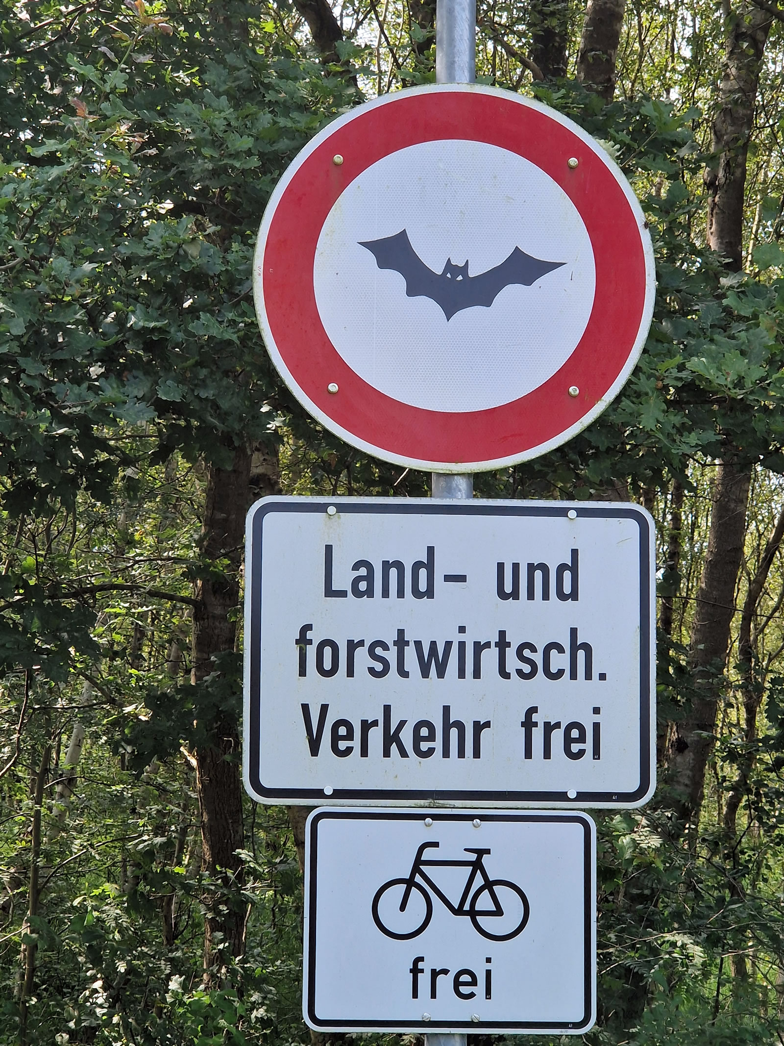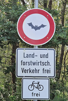 Dat gifft also veel Egenoorden bi disse Deerten. En Fraag blifft bi mi aver noch open: Köönt Fleddermüüs ok lesen oder Verkehrswiesschiller verstahn? Körtens sünd mien Fro un ik mal mit uns Fohrrööd in de Natuur föhrt. An en apen Feldweg steiht dor en Verkehrswiesschild, rund mit rode Ümrannung, merrn binnen dat Bild vun en Fleddermuus. Wat darünner stünn, heff ik verstahn: För Buerns un Förster is de Weg free un ok Fohrröder dröft wiederfohren. Aver wat schöllt de Fleddermüüs maken? Nu, sehn köönt se dat Schild twoors as Objekt, de Opschrift lesen köönt se avers woll kuum, un ok jümehr Ultraschall-Sinn ward jüm kuum helpen. Schietegaal wi warrt uns woll nich in de Mööt kamen, un sönst ward wi uns woll vergahn! Biller: Angelika Cordes 18.8.2024
