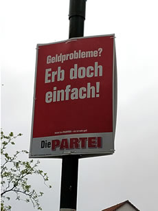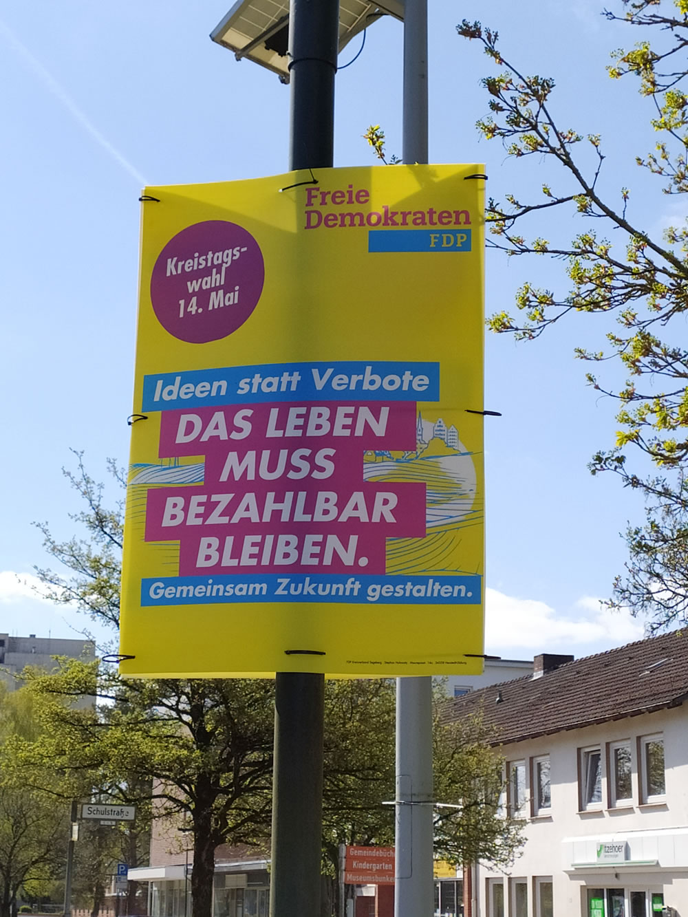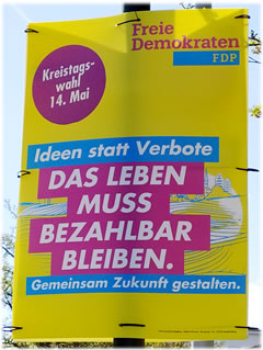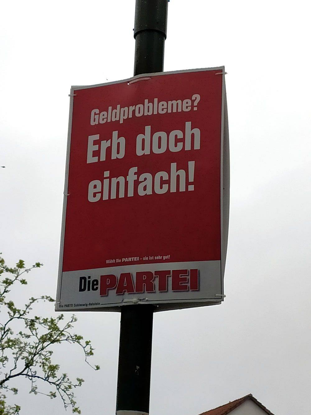 De Wahlkampf is meist nich uttohollen, de Plakate so utermaten fantasielos, dat een denkt, liggt dat an de korte Tied, dat de Partein orr ehr Reklaam-Agenturen sik nix Rechtes hebbt utdenken kunnt? Sühst bloots Köpp as weer en Kopp en Argument. Naja, övertügen doot de Plakaten mehrst ja gor nüms mehr, woto also Argumente? Avers woto denn ok Plakate?? Sooo smuck sünd de Köpp ja nu wirklich nich tominnnst de grote Mehrheit nich! In Hamborg is dat an slimmsten, denn dor is dubbelt Wahlkampf: Bundsdag un Börgerschap. De Stadt süht ut, as weern de franzööschen Revolutionäre dörchgahn un harrn bi jedenen "À la lanterne!" ropen. En Geisterbahn vun ophangte Köpp. Naams un Lü, de een nienich wedder höörn un sehn will. Ja, dat gifft ok hüüt wedder Lü, de all Politikers "À la lanterne!" hangen wüllt. Un ik meen nich de Wahlkampfhelpers vun de Partein. Fiete Merz hett düsse Week de "À la lanterne!"-Banden