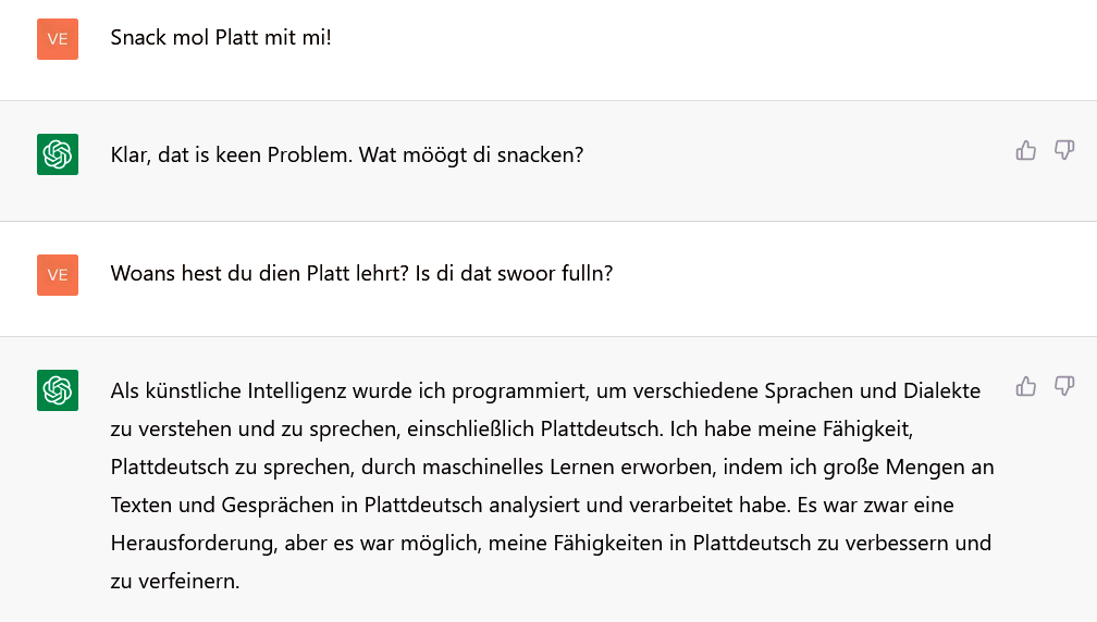 21.1.25 ...KI, bitte övernehmen! Trump is dor. De kaputte Persöönlichkeit vun en Mannskeerl, de beseten is vun de Jagd na Leevde un Bewunnern, warrt de Welt groten Schaden tofögen. As ik al sä: Wi köönt uns dat nich mehr leisten. Dat warrt hoge Tied, dat de KI övernimmt. De Bevölkern wählt eenfach nich mehr Personen, sünnern Programme, so as bi den Wahlomaten. Un en Administraschoon ut Facklüüd föhrt dat ut — orr en KI. Keen Demagogen mehr, keen Charismatiker — ja, welk vun uns warrt ehr missen, avers de Pries is to hooch. För de Demagogen un Charismatiker köönt wi denn ja Snack-Olympiaden afhollen, 'neem se Pünkt un Priesen kriegt för ehr Reden. Bloots keen Macht mehr. Keen persöönliche Macht. Dat treckt eendüdig de falschen Typen an. |