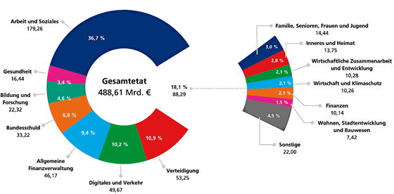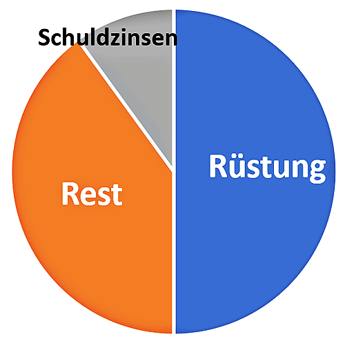 Den Haag hett beslaten, all sünd op Linie bröcht, Trump is tofreden. So warrt wi also opneegst 5% in de Rüstung stecken. Äh — 5% vun wat egentlich? Na? 5% vun'n Bundshuusholl? Nee, dor sünd wi al över 10%. Dat geiht üm 5% vun't Bruttobinnenlandsprodukt (BIP), also de Gesamtweert vun dat, wat in't Land dör Arbeit tostannkümmt. Dat BIP weer 2024 rund 4,3 Billionen Euro, also 4300 Milliarden. Dat landt ja nu avers nich allens as Stüern un Afgaven in de apentlichen Huusholln! Bi'n Bund landt so bummelig en godes Teihntel dorvun. 2025 plaant de Bund, 503 Milliarden uttogeven. Wenn Se de twee Tallen vergliekt, seht Se, de Bundshuusholl is etwa 12% vun't BIP. De plaanten Rüstungsutgaven vun 5% vun't BIP sünd also ——— meist de halve Bundshuusholl! De gröttste Deel dorvun borgtes Geld, dat vertinst warrt... Betherto is de Bundshuusholl so opdeelt: De niege Huusholl is natüürlich veel grötter, opfladuust dör Schulden. De Opdelen süht denn ungefähr so ut: