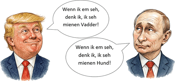Putin hett in Nahoost stillhollen un kriggt to'n Dank de Ukraine as Geschenk över'n Disch schaven. Dorna süht dat nu ja ut. Momang kann Trump Putin de Ukraine schenken? Kann ik dat Huus vun en annern Minschen verschenken? Dor weer doch wat... ach ja, "Verträge zu Lasten Dritter" nöömt de Juristen dat, un solk Verdrääg sünd nichtig. Ik kann nich mit en annern utmaken, dat he mi dat Huus vun mien Naver afköfft. Dor köönt wi noch so veel schöne Dokmenten ünnerschrieven, de Naver behöllt sien Huus. Ok ünner Staaten is dat nix. Hitler un Stalin hebbt Polen fein opdeelt, avers so'n Verdrag is en Luftnummer ahn de Ünnerschrift vun Polen. Schaad eentlich, nich? Friegevig un groottöögsch ween is doch so en schöne Charaktertoog! In en noble Geste en halves Land wegschenken... Un dormit sünd wi al in't Hüüt. De Ukraine warrt ehr egen Opdelen ok nich ünnerschrieven, un liekso as to Hitlers un Stalins Tieden warrt ehr dat gor nix nütten, wieldat nüms mehr internaschonales Recht op de Reken hett. Trump al gor nich. Nich mal binnen de USA akzepteert he ja de Gesetten. Man liekers glöövt he an Regeln "Kumpel-Regeln" to'n Bispill, Gang-Gesetten, Ganoven-Ehr; Regeln as "Een Kreih hackt de anner keen Oog ut". He glöövt, Putin warrt ok stillhollen, wenn Trump sik Grönland halen will... man dor kann he Putin sachs noch kennen lehren. Tja, Anarchie is nich so'n lichtes Fohrwater, as mennigeen glöövt. |