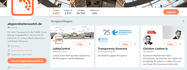 Algorithmen also mathematische Aflööp bestimmt ja angeevlich so veel in't Web. Avers mennigmaal maakt se mi spraaklos. Düt Bild kreeg ik hüüt to sehn: Ik harr jüst tostimmt, de Organisaschoon "Abgeordnetenwatch" op Twittter to folgen. Normaal kriggst denn ja ähnliche Vörslääg nalevert; ik krigg "LobbyControl" vörslaan un "Transparency Germany" un äh? Christian Lindner. Also twee Ähnliche un een Gegendeel. Lindner is ja nu wirklich dat Gegendeel vun Transparenz, Korruptionsbekämpfen un Lobby-Kuntrull! Ik heff bloots twee Erklären dorför: