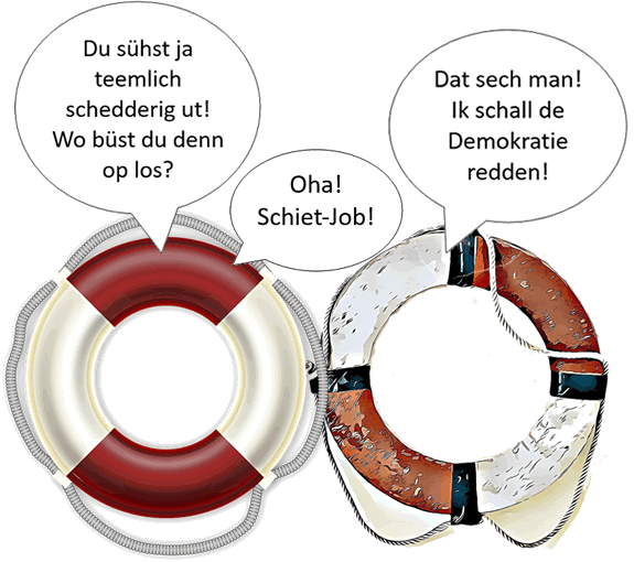 Nich dat dei Arbeit slecht wier; an männich Städen is dat ok blot ein Druppen up'n hitten Stein. Hier un dor kricht 'n Regionalgrupp as dei "Omas gägen Rechts" 'n lütten Tauschuss ut dat Bundsprogramm "Demokratie läben!", un wenn ein Minsch up den Infall kümmt, dat Frömde sik gägensiedig bäder verståhn, wenn's mit "demokratisch" Hülp ehr Fluchtgeschicht riemeln un dei denn in'n "Poetry Project" vörstellen, denn föddert "Demokratie läben!" ok in son'n Fall. Un wecker 'n Vedder in'n anner EU-Land hett, kann denn œwer Grenzen henwech noch Geld ut Brüssel affangen. Un dat allens, üm uns Zivilgesellschaft un dei liberale frieheitliche demokratische Grundordnung tau verdeffendiern.