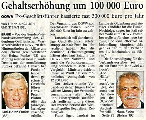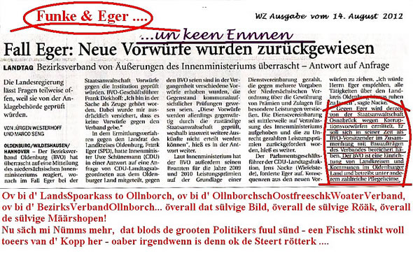 De Ex-Bulami, Handelsschoolmester un Buureninschinör dor bi Voarel in d Dangastermoor hett nich blods siene Vöörstandskolleechen bi d OOWV, sien Parteimakkers und dat heele Volk in d Kuntrei anloagen, dat sükk de Balkens boagen, as de Soak mit sien Sülverhochtiedsbetoahleree van Dach koamen is. He har dat heele Doon ok noch good vöörbereid, in de he de Verbandsgeschäftsföörer sien Gehalt moal ähm so, un oahn irgendeen anner Litt van d Vöörstand dorvan to vertelln, üm Hunnerddusend Euro upbäätert hett. Eenfak so un blods mit sien Teeken ov schull man bi Funke nich bäter särgen: mit sien Kaiser Koarlhein? Ikk kann mi eenfak nich denken, dat dat blossich de verbräkerisch friseerte Sülverhochtiedsrääken wee, de van d Geschäftsföörer föör sien Boas dör de Bööker dörschoaben worden is. Üm föör sükk sülven achtduusend Euro dorbi ruttohoalen, stäekt een Koarlhein Funke nümms Hunnerdduusend Euro in d Mors. Wenn een Buur sükk dat Waark moakt un knoied in so een lüütjied Lokk soveel Pinunsen rin de will an d Ennen sien Quäleree ok good betoalt hemmn. Villicht kriigen de Stoatsavcoaten upletzd noch een büld anner Morsen to foat, in de de Buur ut dat Dangaster Moor Doalers rinschoaven hett, üm föör sükk wat dorbi ruttohoalen Ikk loat mi moal överraschen. |