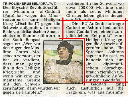 rintillt worden. Dor heeft een dördreiten isloamischen Potentoaten in de noordafrikoansche Drööchte sien Knüppel un droht de Schwiez mit een hilligen Kreech (wat de Keerl aal ümsetten kann, dat hett de Weltgemeenschkupp joa all dääch genooch to weeten kräägen) un de buterwendige EU-Verträäderin weet dorup niks anners to särgen, as dat för disse Drohung Gaddafis woll een bietji de verkeerde Tied wee. Ikk kann disse Worden noch jümmers nich foaten un meen, dat dit Froominsch doch bäter in hör ingelsch Köäken bleeven wee. |
