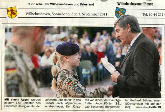 Nu steit joa een Froominsch de Wehrmacht vöör de Keksprinzessin ut Hannower. Najoa tominst is nu ja wäär blau Blood an de Spütz van de Schwadrone. Un de Kinner, de de Suldoaten denn in Tokunft tüügen, de kriecht wiers denn glieks een heel büld van de Welt to sehn, wenn see mit Moder un Voader Suldoat denn mit en Panzer up Sönndachstuur goahn. Wiers givt denn ok bold een Van-der-Leyen-Regiment su as ünner Kaisers anno dunnemoal de Lützowschen Rieder blods ditmaol as Schokkelpeerd-Uloanen mit 52 (tweeunfüfftich) Kusen.