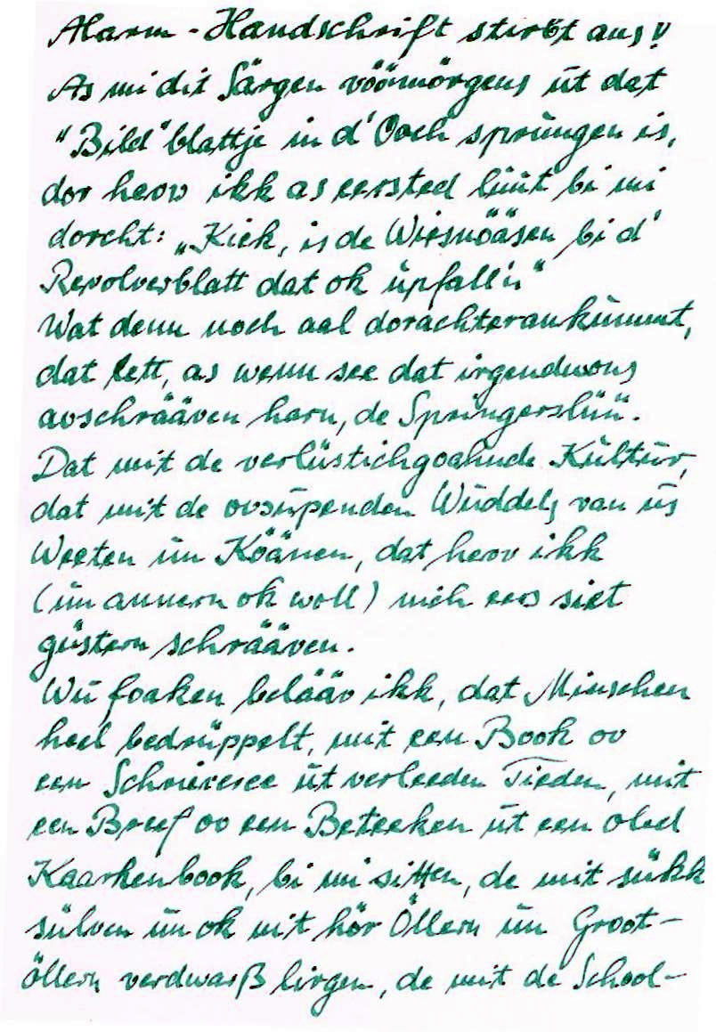 In de Tied, as wi föör dat Undöäch, dat Dummtüüchs, dat Kinner joa sied alle Tieden moaken, van us Öllern noch de een ov anner Loach Hau kreegen, de Tied, as de Schoolmester us ok woll moal över d Knee lärgen drüß, de Tied, as wi vöör de Stroaf, de us verwachten de, noch trillerden, wenn wi denn een Tschako üm de Ekk buugen sehn in de Tied hett dat sowat nich geeven. Ikk froach mi nu un dat nich eers sied disse Noaricht , ov dat, wat use Gesellschkupp dör de grötter Kinnerfreeheit towunnen hett, tägen dat, wat hör dordör verlüstich goahn is, de Wacht hollen kann. Mi dücht, dor is wat bannich scheef in use Örnung. |
