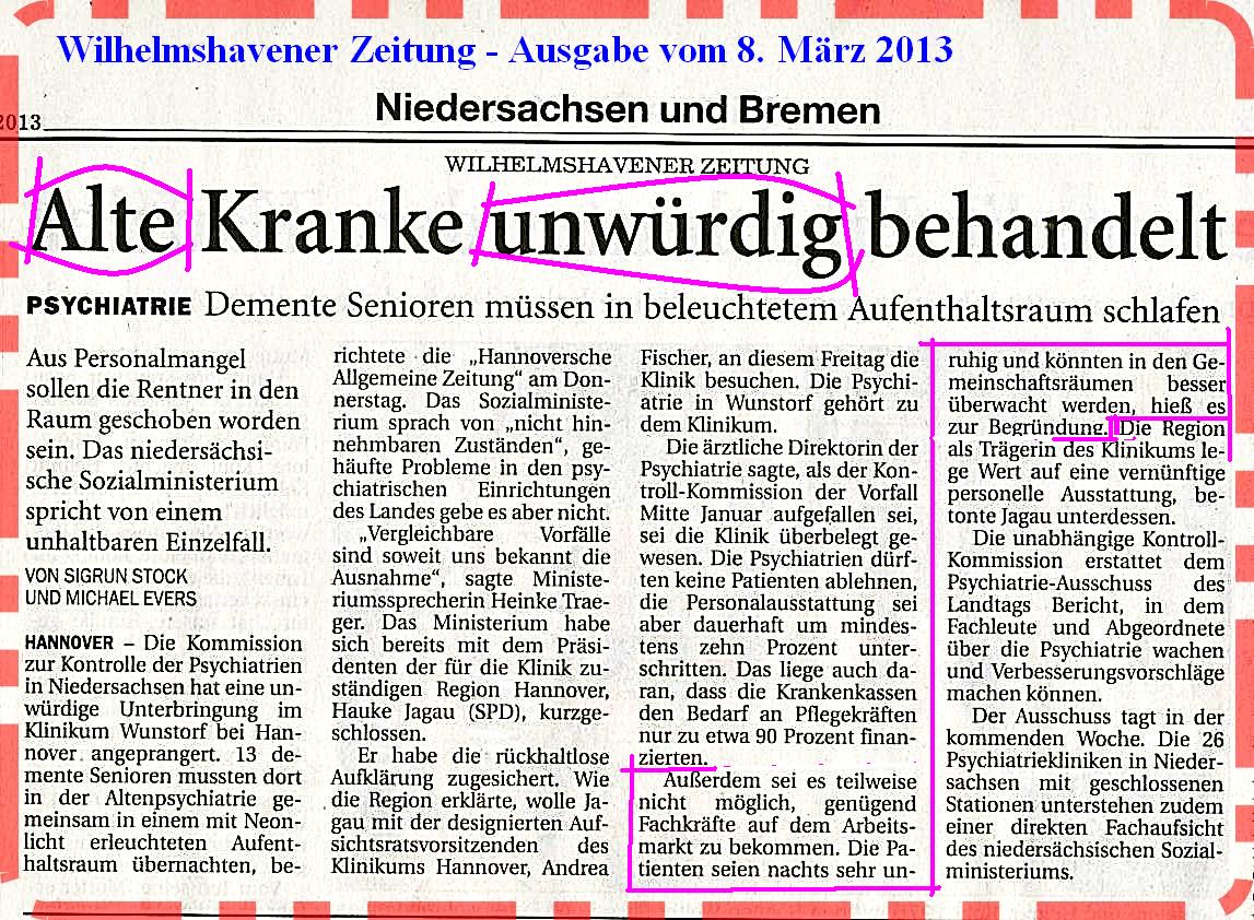 ...denn de Finanzhaien un de Politikers un nu de Dokters un de Heimbedriefers. To glööven is dat nich, wat dor nu as näächst an d Lücht to koamen schient oaber to verwachten wee dat wiers. Geweetenlos Klinikdokters un geldgierich Pläächheimbedriefers hevvt tonanner funnen so as Pott un Dekkel. See sünd hannich dorbi, Minschen un hier sünd dat ole hülplose Minschkes as Hannelswoar intosetten. Geit dat us Mediziners wüggelk all so noar, dat see up Minschenhannel verfalln mooten? Dat moakt mi baang. Bi een Riech van Pläächheimbedriefers wunnert mi liekers all laang niks mehr. Wacht man noch ähm fief Joahr, denn hett ok de Regeern dat Rebett föör sükk utmoakt un een Börse inricht, an de denn mit Senjorenpläächrechten hannelt word. Bispillen givt dat joa all nuch. Brukst doch blods an de Berechtigungsschiens ton Lüchtverpesten denken, de nu joa all van Deefen klaut worden, wiel see sükk so moi licht to Doalers moaken loaten. Een deel Dokters geit in hör Krankenhüüs mit Netten up Fang ut, üm to sehn, well van de Patschenten man in een Pläächinrichting ovschuuven kann tägen een fetten Prämie, dat is doch kloar. Un wiel de Pläächheimbedriefers dor so as maal achterto sünd, de Beärden in höör Hüüs vulltokriegen, bütt de een ok licht moal mehr as de anner. Dat geit woll so as up een Vergantung to: Ton eersten ton tweeden ... un wenner de Pries föör dat Senjorenfleesch hoch genuch is denn gallert de Hoamer ton daarden up de Dischploat, un de Hannel is ovschloaten. Wiel man joa Ehr hett un wiel man sükk van wäägen dat goode mitnanner utkoamen joa revancheeren moot, stüürt man de Minschen to een Behandlung un wenn d denn moal nödich deit jüüst in dat Süükenhuus trüch, van dat man de Woar köfft hett. Üm dat heele Waark eenfaker to moaken Rationalisierung heet dat joa woll , schöält de Pläächeimbedriefers all een Fonds inricht hemmn, in de noa bestimmten Kriterien inbetoalt ward, un up de anner Kant de Dokters utbetoahlt warden. Nümms ok nich de Kassen, de dit Spill joa ton Deel mit Geller van höt Litten finanzeern kann dor achter kieken. Ov will dat villicht sogoar keeneen? Wunnern wüür mi ok dat nich mehr. |