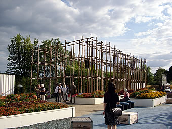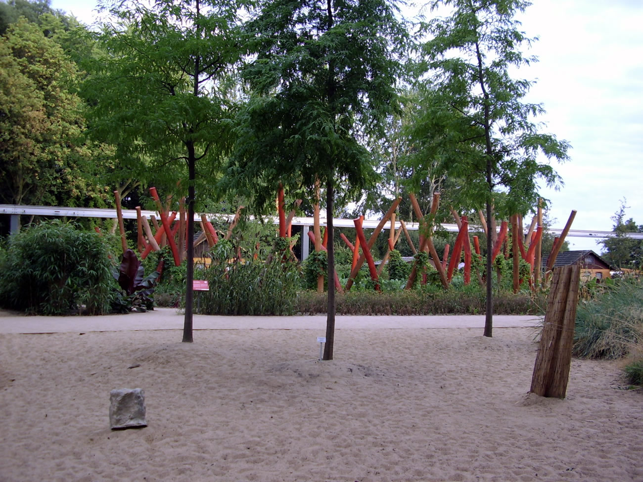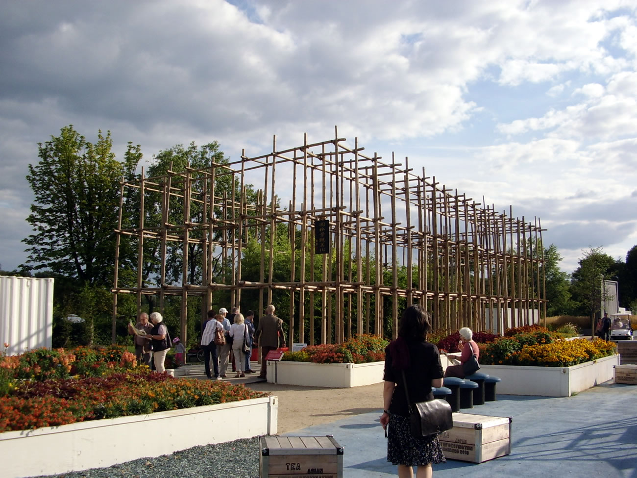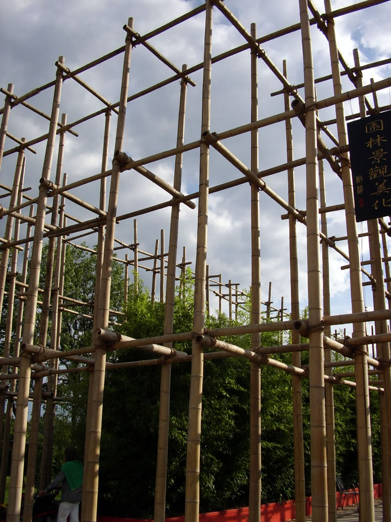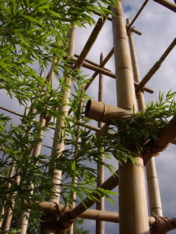 De Bambuswelt gefallt uns good, de Lichtheit un Stabilität vun düt Materiaal is basig. In Asien buut se dormit Holtgerüsten för Hoochhüüs. De Bambuswelt hier is jüst so en Gerüst, mang dat lebennig Bambus wassen deit dat lett, as blöhn de doden Stämm.