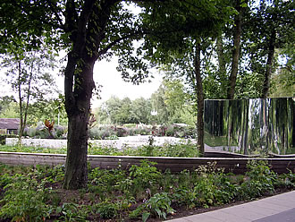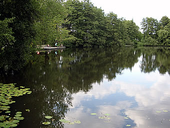 uns to wiet af. Sachs is dat avers bloots physisch meent. Aftoogsgravens orr Wettern loopt hier pielgraad de Ass na den Hööfdingang hooch. Wi sünd op en heel sied Moorflach, dor erinnert se uns an. Man se sünd schöön beplant un passt in de Komposischoon. Rosengoorns sünd hier, de Blöden sünd al raar woorn. To de Rosentied mutt dat hier kaptaal utsehn un duft hebben dorför kaamt wi to laat in't Johr.