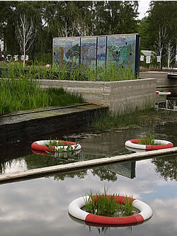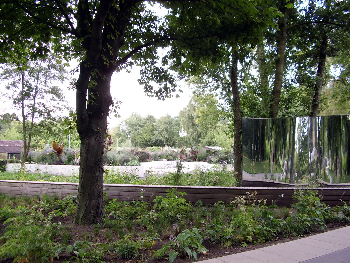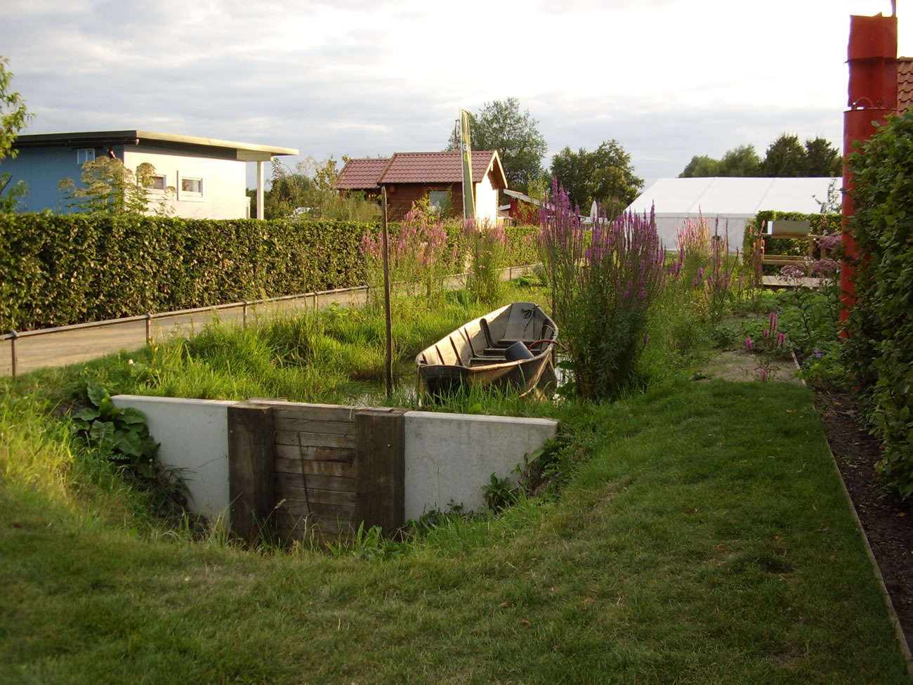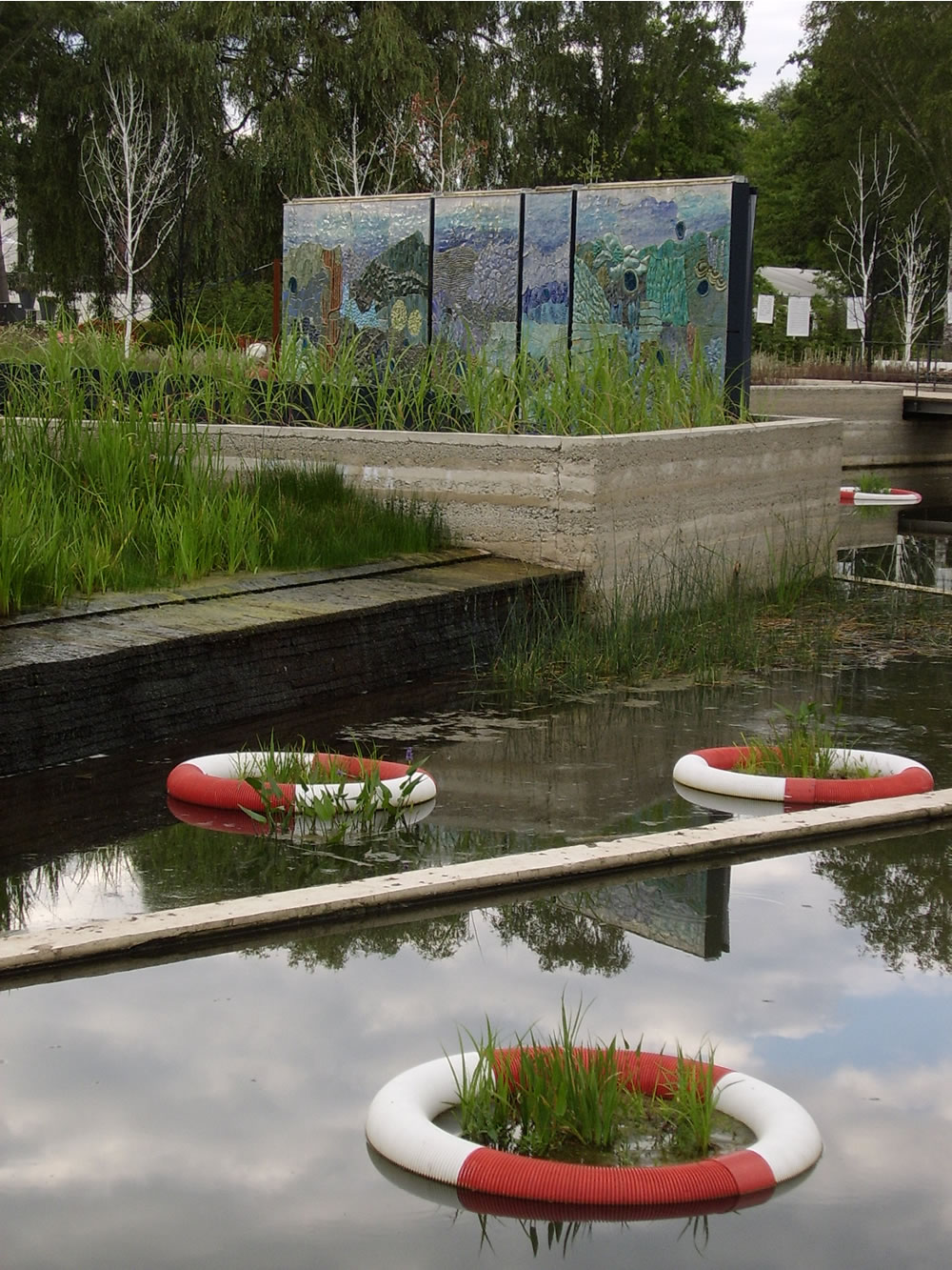 De Brüggenkonstrukschoon lannt in en anmodig Blomenfeld in Rood un Lila. De Rasen is allerdings nich wussen, sünnern Rullrasen, as op't Footballfeld. Hier fangt de Waterwelten an. Twee ansehnliche Seen sünd hier inslaten, de Mahlbusen (heet wirklich so) un de Kükenbrack. Wi besluut, wi wüllt nich üm all rümgahn, sünnern mehr so mangdör op en Weg, de över en smucke Brügg föhrt. Dor sünd wi nu en beten benaut, denn dat lett hier so as in mennigeen hamborger Park: Seeöver mit Bööm. Ganz nett, man annerwegens nehmt se dorför keen Intritt. "Oh! Ji Döösbartel! Ji harrn den Nevelwoold söken müsst! De is wunnerbor. De Nevelwoold is heel versteken!", seggt mi later Kolleeg Andreas, de en Duerkoort hett un hier allens kennt. Tja, den Nevelwoold hebbt wi nich funnen. Na de Welt vun de Religionen gaht wi nich rop, wi böögt achter den See "Kükenbrack" rechterhand af. Hier geiht dat na de "Niegen Hamborger Terrassen", un wedder süümt niege Hüüs den Weg. De Lü, de hier wahnt, hebbt dat wohraftig nich slecht drapen!! Man se mööt dat ok betahlen könen. Ümsüss kann dat nich ween.
