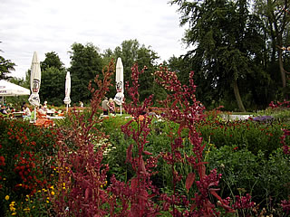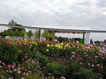 Dorachter geiht dat wieder na de "Welt vun de Kontinente". De "Aafrika-Goorn" grööt mit rode Robinienstämm, de en Kraal andüden schallt. Ümrüm sünd Bananenstauden plant, de apensichtlich vun ünnerscheedlich Soorten stammt. Kochbananen? Eetbananen? Hier as annerwegens ok harrn wi uns mehr Infos wünscht. De "Welt vun de Kontinente" hett faken wat Vördergründigs, Banales för uns. Wööst: Sand. Aafrika: Kraal. Pyramide: Ruine. Un so wieder. Dat dücht uns, as wöör mit Klischees arbeidt. Sachs is dat avers ok nich licht, op engen Ruum enkelte Akzenten to setten, de depere Insichten vermiddelt. Dat Bild baven wiest düsse Överflächlichkeit bispeelhaft. Dat Bild wiest veer Goorns opmaal: achtern den Oostasien-Goorn mit en överdimensionales chineesches Stäbchen-Orakel (kannst wirklich Orakel mit trecken), rechterhand in'n Achtergrund en araavschen Goorn mit Telt mit Kissen binn un Sand ümrüm (ja wirklich staats de wunnerboorn Watergoorns, de wi in't maurische Spanien findt), rechterhand vörn en "Alpengoorn" mit Nadelbööm un en "Via Mala", de vun Steen süümt is (de Steen erinnern uns an de Oosterinsel), linkerhand vörn den "Olivengoorn", de eenfach en leevlos anplante Olivenhain is. Fernanda, de ut Spanien stammt, seggt, de Bööm warrt dat sachs nich överleven, de Wötteln seht al slecht ut. Linkerhand, nich op't Foto, stunn noch en grote Infowand to Olivenööl mit Rezepte! Reinweg afsurd warrt dat in den "Noordamerikaanschen Goorn", de glieks to Ingang vun de "Kontinentwelten" liggt. Dat is gor keen Goorn, sünnern en politische Polemik. Op'n Borrn sünd sellschapliche Slagwöör "plant", so as "Democracy" un "Upward Mobility", un symboolsche (Un-)Kulturelemente, so as de Ketchupbuddel. Hier also kriegt wi kulturelle Klischees nochmal mit'n Holthamer verpasst. För US-amerikaansche Besökers stell ik mi dat reinweg kränkend vör. Weer dat wirklich nödig? Op en Goornschau??? Veel beter hebbt dat de Schrebergoorners, de nu rechterhand liggt, denn de Graven blangen ehr Kolonie is wunnerschöön mit Rohr un Gräser anplant. Wi böögt nocheens af na den "Verlaren Goorn", de en Speelplatz ween schall un wirklich orrig verlaren wirkt. He hett dormit wat Authentisches, solk Ecken kennt wi in Wilhelmsborg. Dorachter treckt sik en smalle Striepen "Naturwelten", man de entgeiht uns so'n beten, denn uns treckt dat na de grote Böhn an'n Ingang to de "Lebennigen Kulturlandschapen". Vun dor kümmt Musik un Lachen. Man ehrdat wi bi de Böhn ankaamt, geiht dat dör dat schöne Duppelhalvrund vun den Dahliengoorn. Is Dahlienblööt! Dat lett wirklich wunnerbaar. Dat gifft ok apen Dahliensoorten, 'neem de Insekten wirklich mal an den Pollen rankaamt. Schöne mehrklöörige Soorten sünd dorbi. Wi bewunnert de Pracht.
