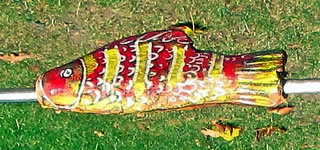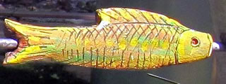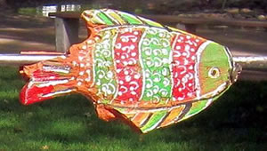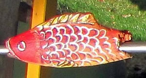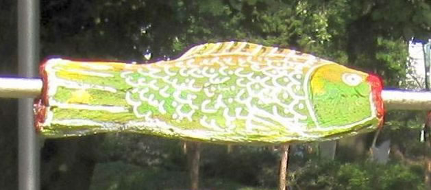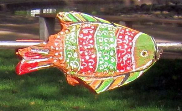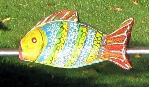 "Achteran schöpf he dat Gröön, Ik heff blots wenig photographeert leider ik weer to dull mit Kieken beschäftigt. Man vun den Dag heff ik ene Upnahme maakt, as Gott de Deerten in't Water un in de Luft maakte, as he also ok de Fisch maakt hett. Ünnen leeg blaag farvt Sägespäne un dor över weer en Ring mit wunnerfien bunte Fisch. "He füng glieks an. Toeerst schöpf