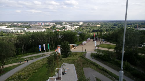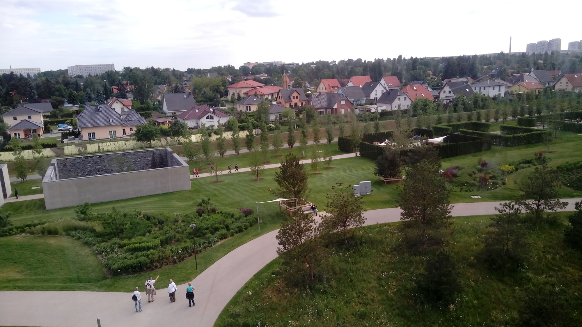 Den Rosengorden willn wi uns ok ankieken, oewer dei Rosentied wier ja in'n Mai noch nich dor. Dei iersten Knuppens bräken gra' up. An den Spälplatz mit den groten Wal un an den' Irrgorden vörbi gahn wi na dei Seilbahn un führn dormit up den Kienberg. Dor steiht ein witter Turm mit Café un Utsichtsplattform. Wi klarrern nich hoch, wi führn hoch. Väle Minschen stahn baben. Ein Jung röppt: "Das ist ja ein Knaller! Mahrzahn liegt mir zu Füßen!" Recht hett dei Jung. Von hier baben ut, wo dei Wind bannig pusten deit, kieken wi up ein von dei gröttsten Plattenbusiedlungen in Europa, inbett't in väl Gräun. 260 000 Minschen wahnen hier.