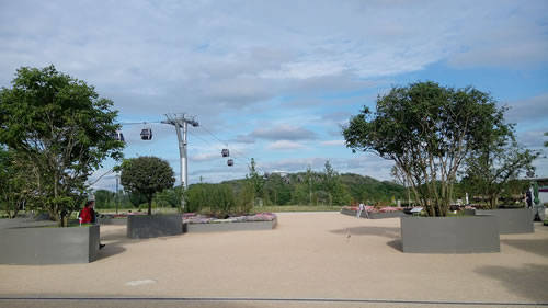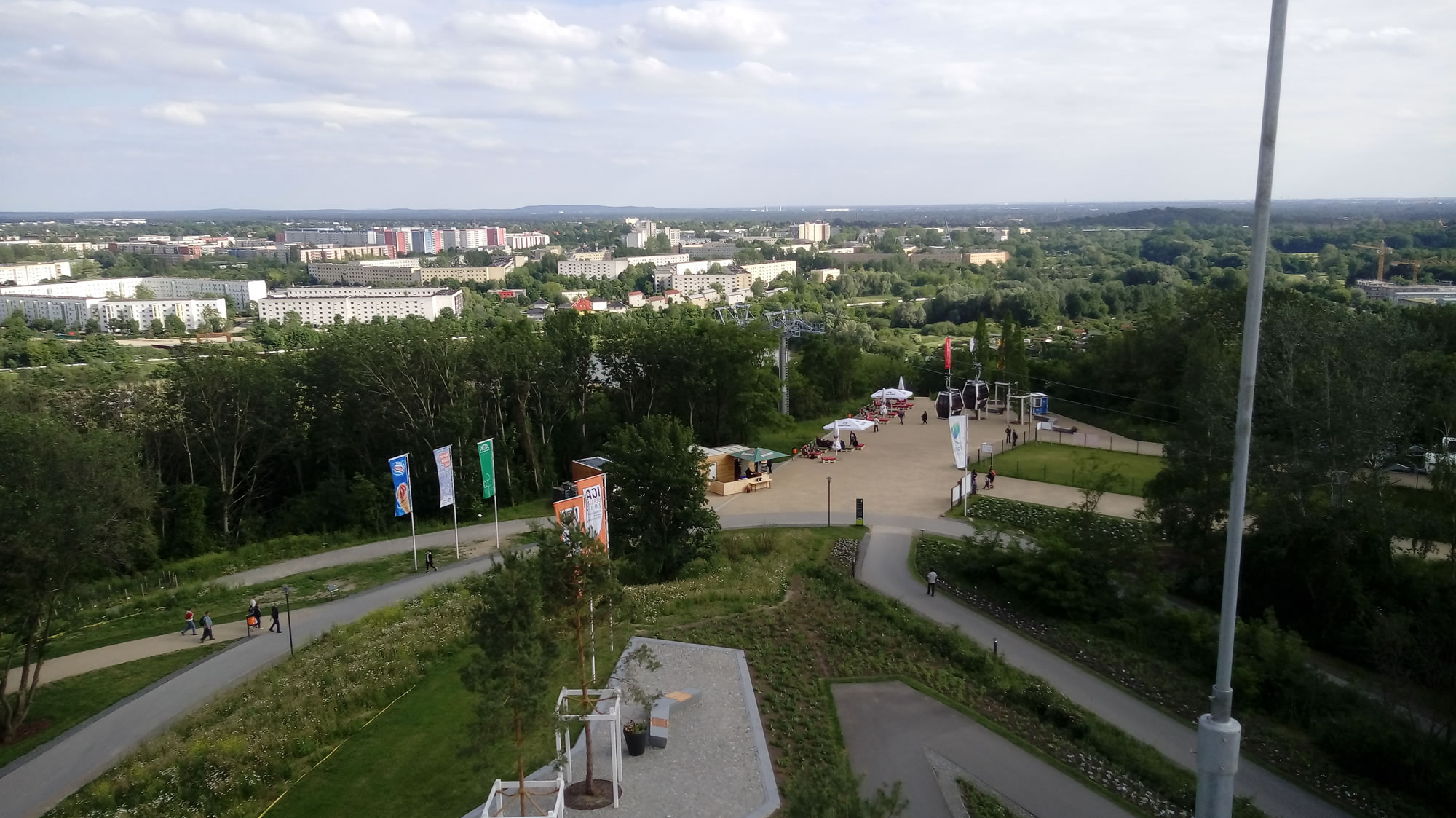 4 Stunnen bruken wi bet na den' IGA-Parkplatz "Kienberg". Kiek an, dor führt jo ok 'ne Seilbahn, gradso as dormals in Rostock. Betahlen möten wi nicks, dat is allens all in den Intrittspries mit binnen! Also rin in dei Gondel un den' Utblick geneiten. Den erläben wi bi Sünnenschien un starken Wind. Dei Gondel is apensichtlich robust konstruiert: sei wackelt, stoppt, schüttelt uns dörch un sust wierer. Ünner uns seihn wi schöne Wannerwäge, väl Holt, 'ne Koppel mit brune Käuh, grote Blaumenrabatten, Spälplätze un Blaumenhallen.
