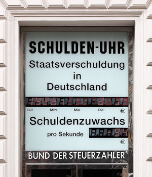 De twete wichtige Klock is de Klock, de en de Schullen vun uns Staat anwiesen deit. Woveel Geld wi all tohoop Banken un anner Geldgevers schullen doot. Ok düsse Klock wiest de Schullen op de Minuut nipp un nau an. Wat heet hier nu "Op de Minuut"? Wat is, wenn sik de Minuten ännern doot as bi dat Ümstellen vun de Tiet vun Winter op Sommer? Hebbt wi denn in een Minuut bi dat Ümstellen nu mehr Geld op'n Kopp haut as ahn Ümstellen? Warrt mehr Geld in de Wintertiet oder in de Sommertiet utgeven oder slimmer noch, verbrennt? Ok dat is en Klock, de mit de Tiet löppt un ümstellt warrt mutt, blots woans funktioneert dat un wokeen maakt dat? Uns Finanzminister oder stickt annere dorachter? Tellt wi nu vörwarts oder trüchwarts? Wokeen weet dat un tellt mit de Tiet mit? Klock is Klock un Wintertiet is keen Sommertiet. As Kind hebbt uns de Olen vertellt, dat Middeweken de wichtigste