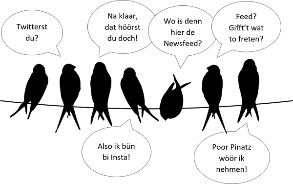 To'n Dag vun de Mudderspråk vun Behrend Böckmann Man künn ja ok den "Plietschen Feudel" kåmen låten, wenn "Reinmåken" in't Büro orrer inne Wåhnung ansecht is. wer ne, ünner "reinmåken" is kein Ünnernähmen tau finnen, denn dei Ünnernähmen von disse Oort gäben sik modern un hemm' wunnersåme Nåmen as taun Bispill "Cleaning Service". Tau Tieden, as Größing un Mudder noch dei plattierten Siedenstrümp mit Naht wer dei Wåden treckten, keem dat vör, dat dei Nåht nich so ganz gråd von'n Hacken nå båben güng un dat denn heiten hett: "Dei Nåht is scheif". Un as Antwurt keem denn ümmer: "Schief is inglisch un inglisch is modern". Un dat is hüt noch so. Nich uns Lüüd ståhn, sonnern unser "Team" orrer "Crew" steiht tau Deinsten. Besonners erfinnerisch sünd dei Horschnieder. Näben "Cut un Color" orrer "Color un Cut" för Schnieden un Farwen von Hor finnen wi Horschnieder, dei sik "Haircutter" näumen un dei Kundschaft mit 'n "Buzzcut" as Modeschnitt anlocken willen. Warüm kann dat nich heiten "Stoppelschnitt is wedder in Mod" orrer "Bi uns gifft dat den besten Stoppelschnitt för Manns- un Frugenslüd"! wer as dei Ollen dat blot von dei Nåht in'n Siedenstrupp secht hemm', dat dat dei inglisch Mod' is, wenn's nich gråd wer dei Wåden güng, so weit 'n hüt männigmål nich mihr: is man noch in Düütschland orrer doch all in Ingland? Kåmen sik twei Fründinnen inne Mt un