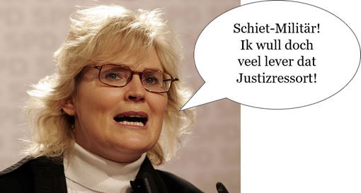 AKK dei röm'sch-kathoolsche Annegret Kramp-Karrenbauer löst Flintenuschi af. Sei harr ok dei politisch Tippel-Tappel-Tour von'n lütt Amt in't Saarland wer Ministerposten un denn Ministerpräsidenten nå ganz båben schafft. Sei hett Politik un Recht studiert, ward CDU-Maat in jungen Johren, friecht un is bald Mudder von drei Kinner. Sei höllt nicks vonne Eh för all, måkt tau Fastnacht 'n Witz taun Transgenderlokus un ward dorför mit den "Negativ"-Pries "Miss Homophobia" ihrt. In Berlin ward sei denn Kriegsministersch, sotauseggen ok as Siedeninstieger, un sei ward dei Bundsbaas vonne CDU. Doch dei Thüringer Frünn' måken ehr dat Läben schwor un sei gifft dissen Posten up. As Kriegsministersch hett s' allens dån, dat dei düütsche Säkerheit ok an'n Hindukusch verteidigt wür! As in Mali Putschisten anne Macht keemen, dunn wür ehr dei russ'sche Pistol up'e Brust sett't. Villicht is sei froh, dat nu ünner dei rod-gäl-gräune Regierung dei evangel'sche Anwältin Christine Lambrecht (Jahrgang 1965), dei sik as SPD-Maat*in von ünnen nå båben strampelt hett, dei drüdde düütsche Kriegsministersch in Folge is. In'n Volksmund hett sei den Ökelnåmen "Strickliesel" krägen, wieldat sei giern kåkt, Kåkbäuker schrifft, nå'n Uteinannerlopen allein ehrn Shn Alexander uptreckt un bemuddert un em mit up Deinstreisen nimmt, dei sik giern präsentiert. Hett sei tauierst Stahlhelms inne Ukraine liefert, organisiert sei nu den Panzerringtusch för dei Ukraine un dei Liewerung von schwore Waffen un äbenso dei Liewerung von warme Ünnerbüxen för dei ukrain'schen Soldaten. Dat Larmen un Lamentieren werlött sei dei gräune