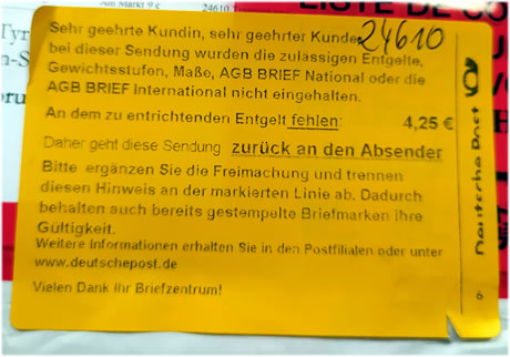 Wat? 200 Sendungen per Johr schall ik in't Butenland verschicken? Nixda! Ik kann also gorkeen Breefmarke mehr online betahln un utdrucken. Prima. Fortschritt. Dor woor mi dat to bunt. Woso schull ik mi hier en Been utrieten?! Ik heff dat eenfach so frankeert as de annern Bökersennen an den Dag un in'n Breefkassen smeten. Villicht kriggt dat ja nüms mit, un dat bummelt so stiekum na Öösterriek! Puustekoken. Dat Book keem torüch mit düssen Opbacker: Nu heff ik endgüllig kapituleert, bün na'n Postkiosk un heff dat tosättliche Porto köfft. Winst maak ik mit dat Book denn nich mehr ik harr dat ganze Porto nich vörweg op de Reken schreven. Harr ik dat daan, harr de Bökerladen dormit Minus maakt. Nu överlegg ik mi, wat ik en annern Breefdeenst utprobeern orr gor nich mehr in't Butenland levern schall. De Post op jeden Fall hett mi blangen ehrn Weg in den Foortschritt op de Streck liggen laten. 2.8.2022