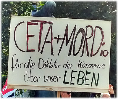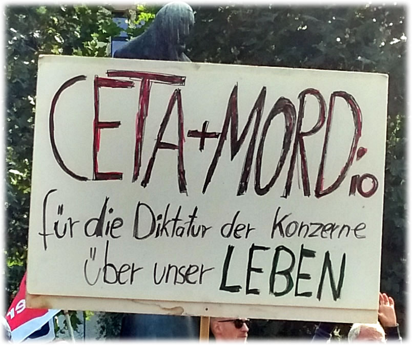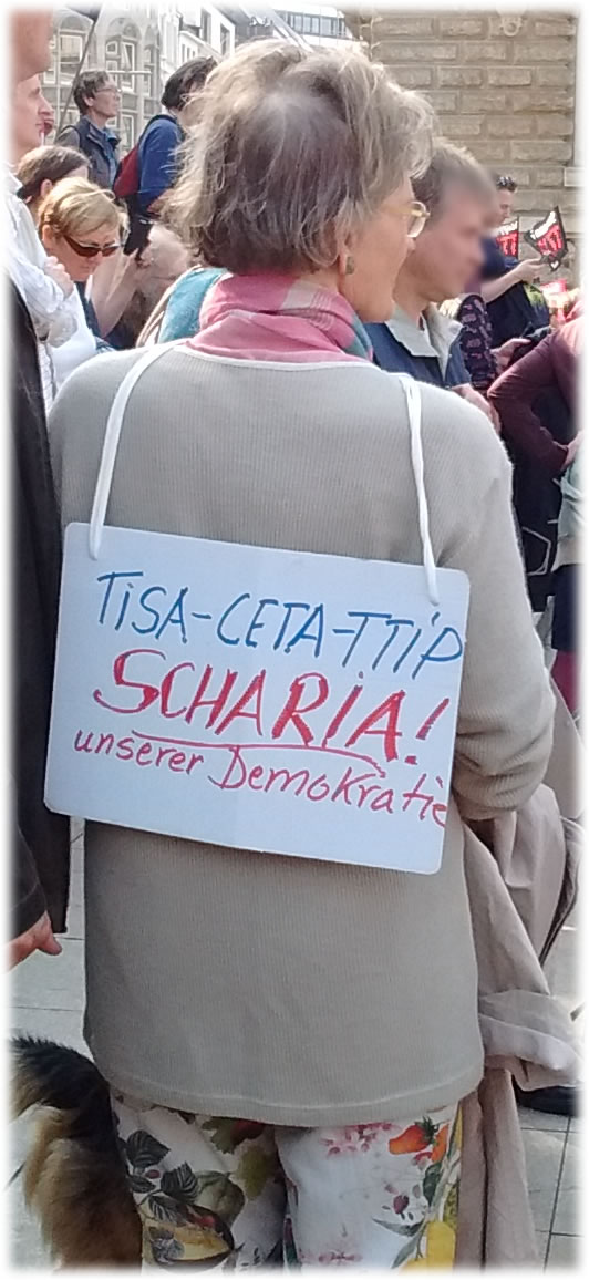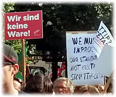 Mit de twee "Hannelsafkamen", sünnerlich mit CETA, warrt dat nu hoge Tied, dor noch en P dorvör to setten. De Argumenten mööt wi hier nich wedderhaaln, al vör Johren hefft wi gode Quelln dorto hier bi Plattpartu verlinkt. Dat geiht üm nich weniger as uns Demokratie gegen de Övernahm dör de Weerschap to verdeffendeern. Ganz sülvstlos wüllt de Grootkonzerne uns ok noch de letzten frien Entscheiden afnehmen! Mennig vun de Argumenten staht hier un welk staht ok op de Plakaten op. Snaaksch is, dat vundaag masse Lü uns ach so sülvstbestimmte Levenswies gegen "Frömde", Migranten, Flüchtlinge verdeffendeern wüllt, de angeevlich bloots Kosten bringt un keen Stüern tahlt; dat avers de Profitgier vun internaschonale Konzerne, de narms Stüern tahlt, en veel grötter Bedrauhn ween kann, is ehr nich bewusst. Man de Industrielobbies laat ja nich locker, as'n Hund, de sien Büüt nich ut de Fäng geven will. Dat neegst Afkamen, dat se versöökt, warrt TISA ween; dor geiht dat üm Deenstleisten. Weer dat nich schöön, wenn endlich ok uns öffentliche Waterversorgen privatiseert wöör un Nestlé orr RWE uns slechter Water to höger Priesen verköpen dä? Süh, dat kriegt wi mit TISA. Alternative: Hier. Un wählen. Un demonstreern.