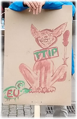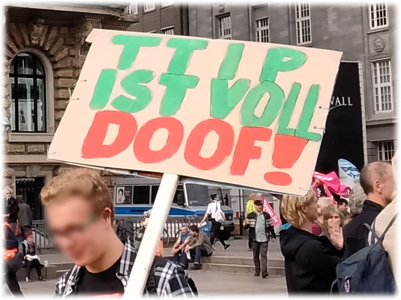 De Reden will ik nich wedderhaaln; bi solk Veranstalten is ja tomehrst al Konsens. De Reden weern good, Fruuns vun de Kark, ut de Landweerschap un vun de Organisaschoonsgrupp hebbt spraken; un de Musik weer 1 a. Tovörderst avers gah ik na so'n Demo, üm Lü to drapen, ehrn Optoog un ehr Plakate to sehn, mit ehr to snacken un ehr Sichtwiesen wiestokriegen. Hier de schöönsten Plakate vun de Demo gegen TTIP un CETA (sünner Gewähr mach ween, dat mi noch schönere dörchflutscht sünd). Sünnerlich gefallt mi ja jümmers de sülven maakten, handmaalten mal mehr, mal minner originell. Besünners toseggt hett mi bi de Optaktveranstalten Klock 12 op'n Raadhusmarkt de liedenschapliche Reed vun de Melkbuursche, de in to Harten gahn Wies un Wöör klorstellt hett, wat för'n Gefohr de Afkamen för de Landweerschap in lütte Familienbedreven is se warrt över de Kling springen, bloots de Agrarindustrie warrt TTIP överleven. Wieldat dat de Nohren en Punkt is, de all direkt bedrepen deit, leeg dor groot Gewicht op, so hebbt ok Buurn mit ehr Treckers den Demo-Toog anföhrt, as he sik so bi Klock een Richt Alster in Bewegen sett hett. Good gefulln hett mi noch de Redner vun Greenpeace, de in sien Iever verspraken hett, "Zitip un Teta" to Fall to bringen (sünd dat noch twee Afkamen? Ik dach, wi harrn mit Titip un Zeta noog...)