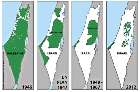 An'n Enn' von 2. Weltkrieg läben in dit Rebeit all 30 Purzent Juden — un dei Inglänner as Schutzmacht kriegen dat nich hen, dat Araber un Juden frädvull näbeneinanner läben, taumål dörch dei Taustänn' in Europa mihr un mihr Juden in Palästina 'n niege Heimat säuken. Doch dat gifft 'n Problem, denn dor, wo dei Juden sik ehrn Staat Israel wünschen, dor läben nu all so anne 2000 Johr dei Palästinenser, un ok dei Muslime hemm' hier ehr Hillig Städen. Un so finnen nich all Araber dei Ansiedlung von Juden ganz koscher; sei kriegen sik mit dei Inglänner un inwannerten Juden inne Plünnen, un Ingland gifft sien Palästina-Mandat, dat miehr un miehr tau'n Last warrt, ielig as ein hitte Kartüffel an dei intwüschen grünnt UNO (as Nåfolger von'n Völkerbund) af. Un denn beschlütt dei UN-Generalversammlung an'n 29. Näwelmånd 1947, ut Palästina för knapp 600.000 inwannert Juden un dei ansässigen 1,3 Milljonen Palästinenser twei Staaten tau billen. Dei Juden süllen denn 56% vonne Fläch kriegen — un dei Palästinenser, dei bet dorhen tau 90% dei Fläch beseeten, sik nu mit 43% begnäugen. Dei Rest von 1% üm Jerusalem rüm süll ünner internatschonale Verwaltung stellt warden. Dei Juden stimmen dissen Plan tau, denn för sei wier dat ja ein Winst; dei oltansässigen Palästinenser un ehr arab'schen Nåwern sünd dorgägen, denn sei harrn ja bethertau meist allens hatt un seihn dat as ehr eigen an. Liekers röppt dei israel'sche Poletiker David Ben-Gurion an'n 14. Mai 1948 — hei wier tau dei Tiet Vörsedder von'n Jüd'schen Exekutivrat in Palästina — den Staat Israel in't Stadtmuseum von Tel Aviv ut. Dei arab'schen Nåwerstaaten Ägypten, Jordanien, dei Libanon un Irak sünd vergnatzt, denn sei wullen, dat 'n palästinen'scher Staat entsteiht. Un so rücken's gliek an'n anner Dach mit Truppen in den an'n Dach tauvör grünnten Staat in —— un verliern dissen iersten israel'sch-arab'schen Krieg, dei ok as Unabhängigkeitskrieg bekannt is. Mit dei Staatsgrünnung wür fastlecht, dat dei Palästinenser up 40% von't Westjordanland mit Ostjerusalem un den Gazastriepen ehrn Staat grünnen künnen. Œwer dei Palästinenser un arab'schen Nåwern seihn dat anners, sei wulln den Staat Israel oewerhaupt nich akzepteern; un so keem't gliek taun Krieg, un Israel lött mit Hülp von Treckvadder Amerika dei Palästinenser dat fäuhlen. Israelisch Truppen nehmen in't Westjordanland dei Urte Lydda un Ramle in un jågen twüschen 50.000 un 70.000 palästinee'sche Araber in't jordaan'sche Exil.